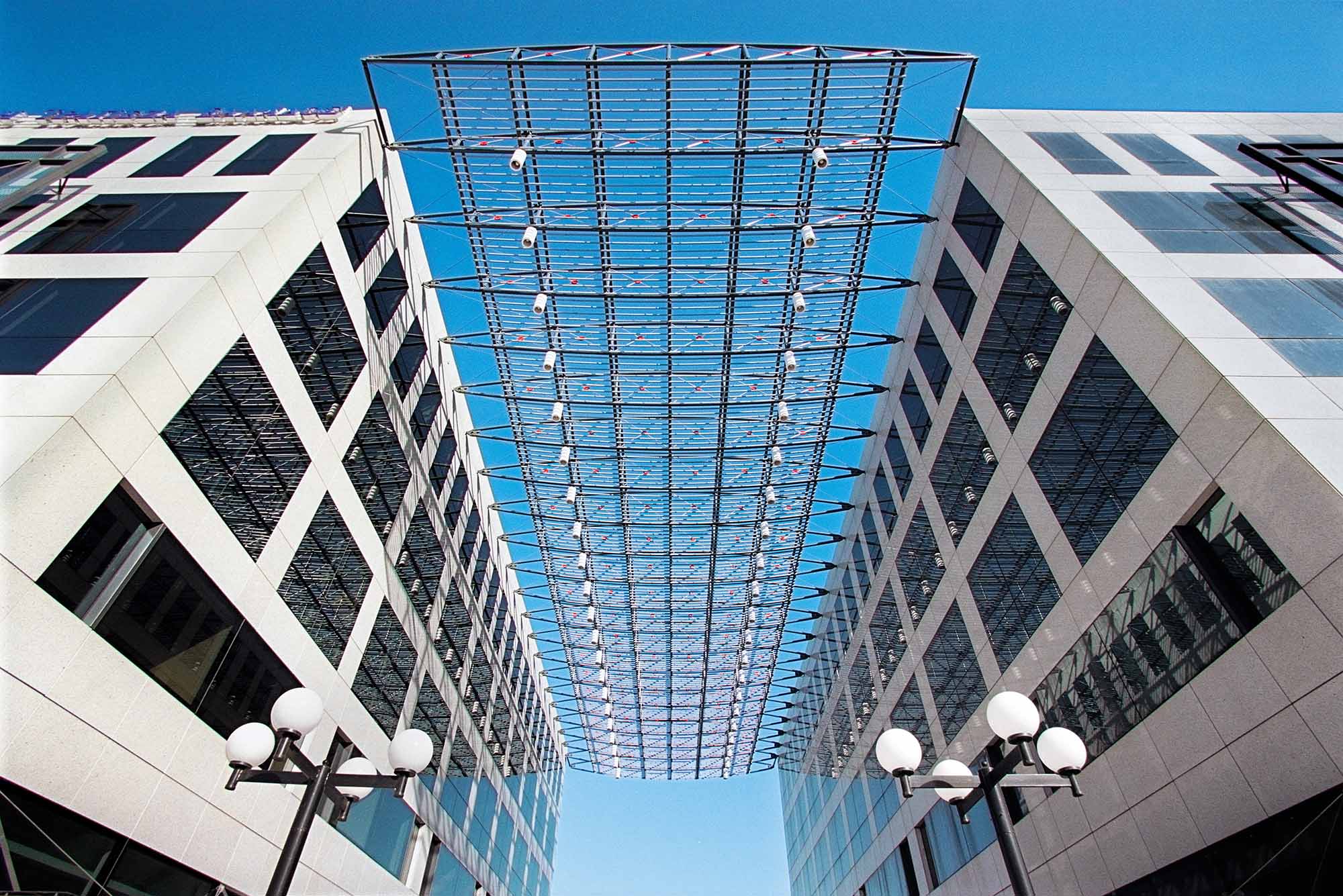 The compositional element, assigned to redefine the identity of the ensemble, is the intermediate courtyard connecting the rear and the frontal open space. The covering metal canopy, connecting the two buildings, lends a particular identity to the complex. The structure of the space frame consists of twin elliptical arcs of circular profile, and solid steel tension rods. Smaller, curved, round profiles, attached in a dense arrangement underneath the primary arches, were used to create pleasant shading.