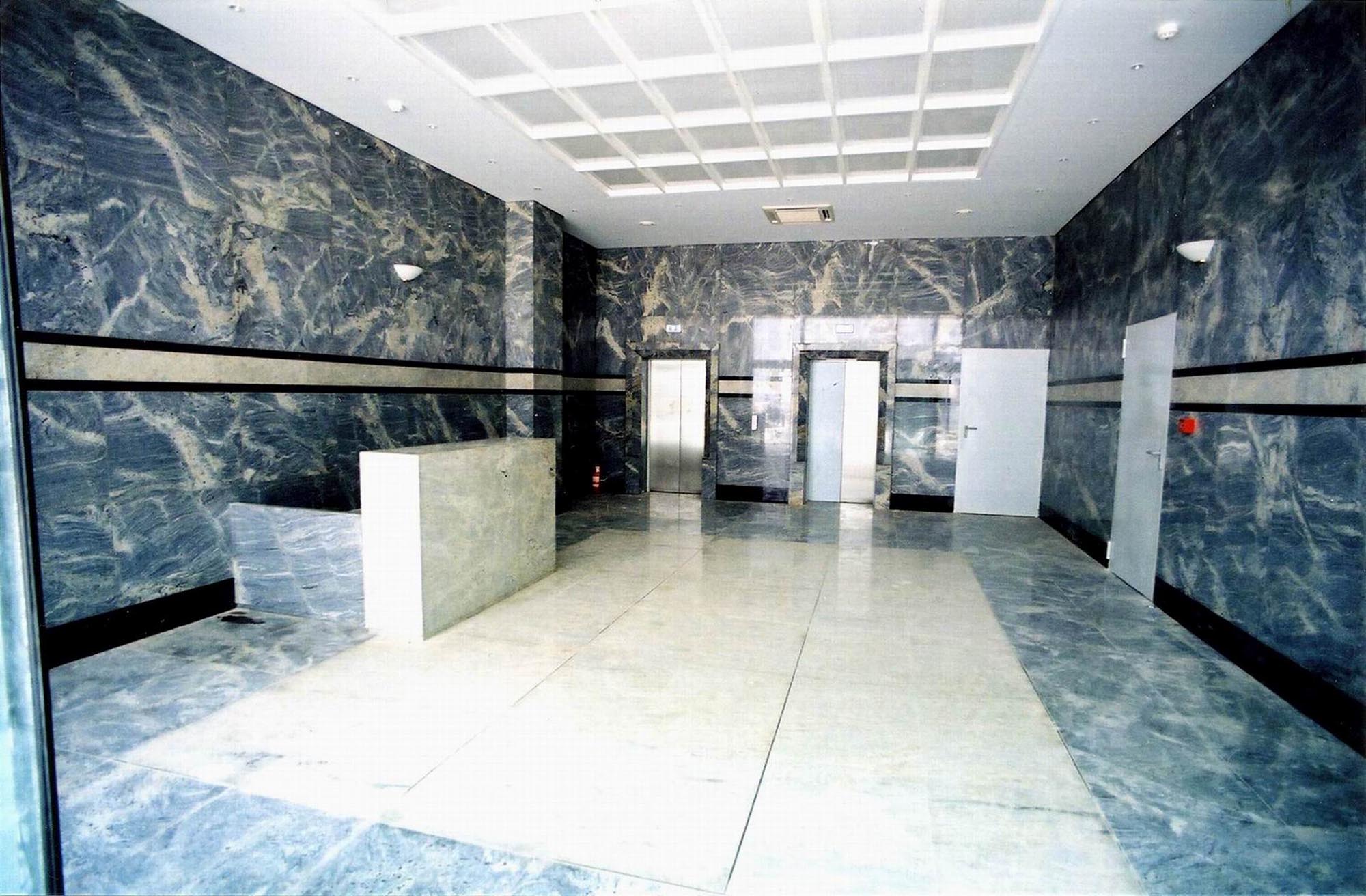 The elevations are formed by white granite and grey-blue glasspanes. The proportions of the openings are differentiated on each floor, with gradual reduction towards the top of the building. In reference to the perforated metal roof, square steel frames were suspended from the narrow front elevation of both buildings.