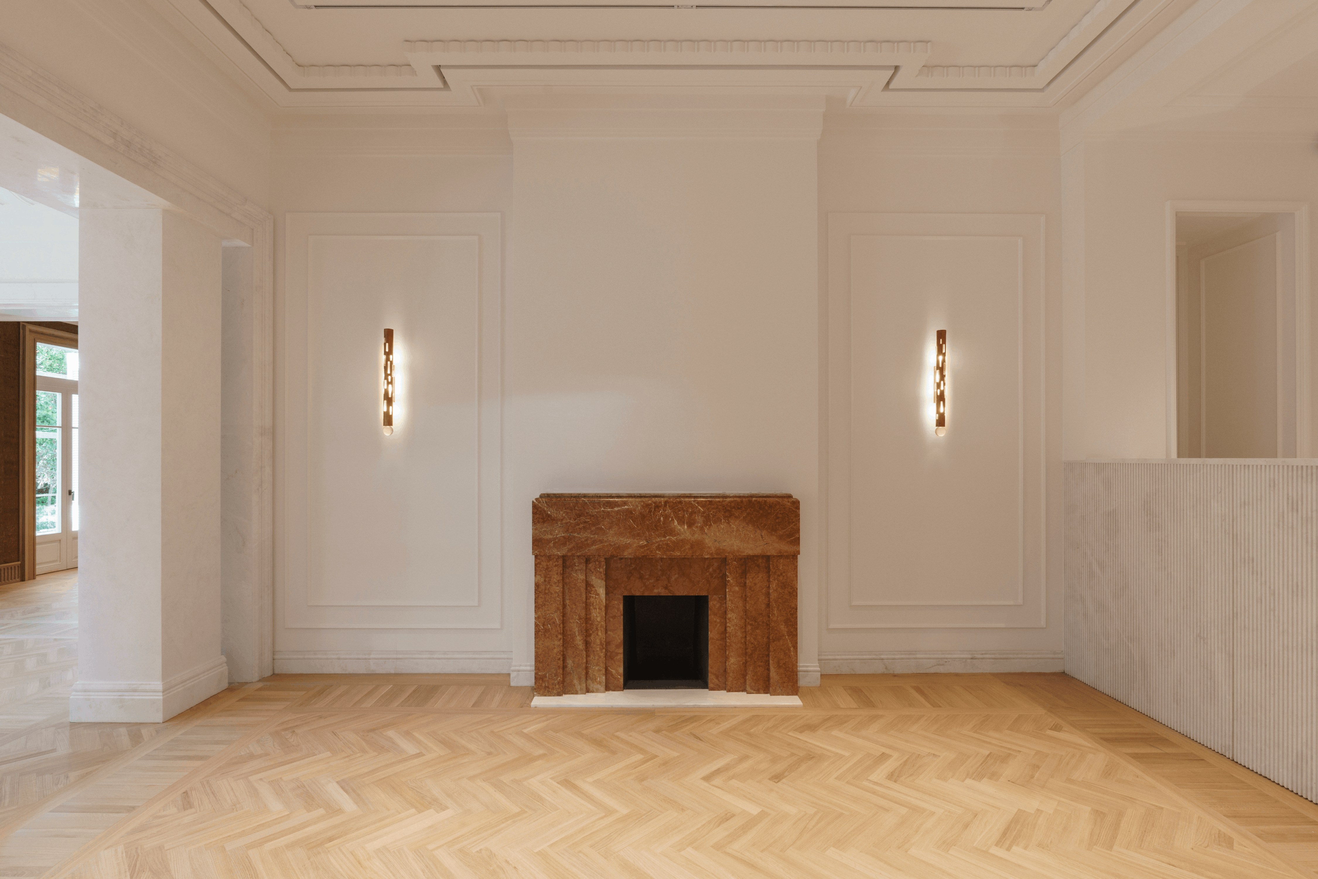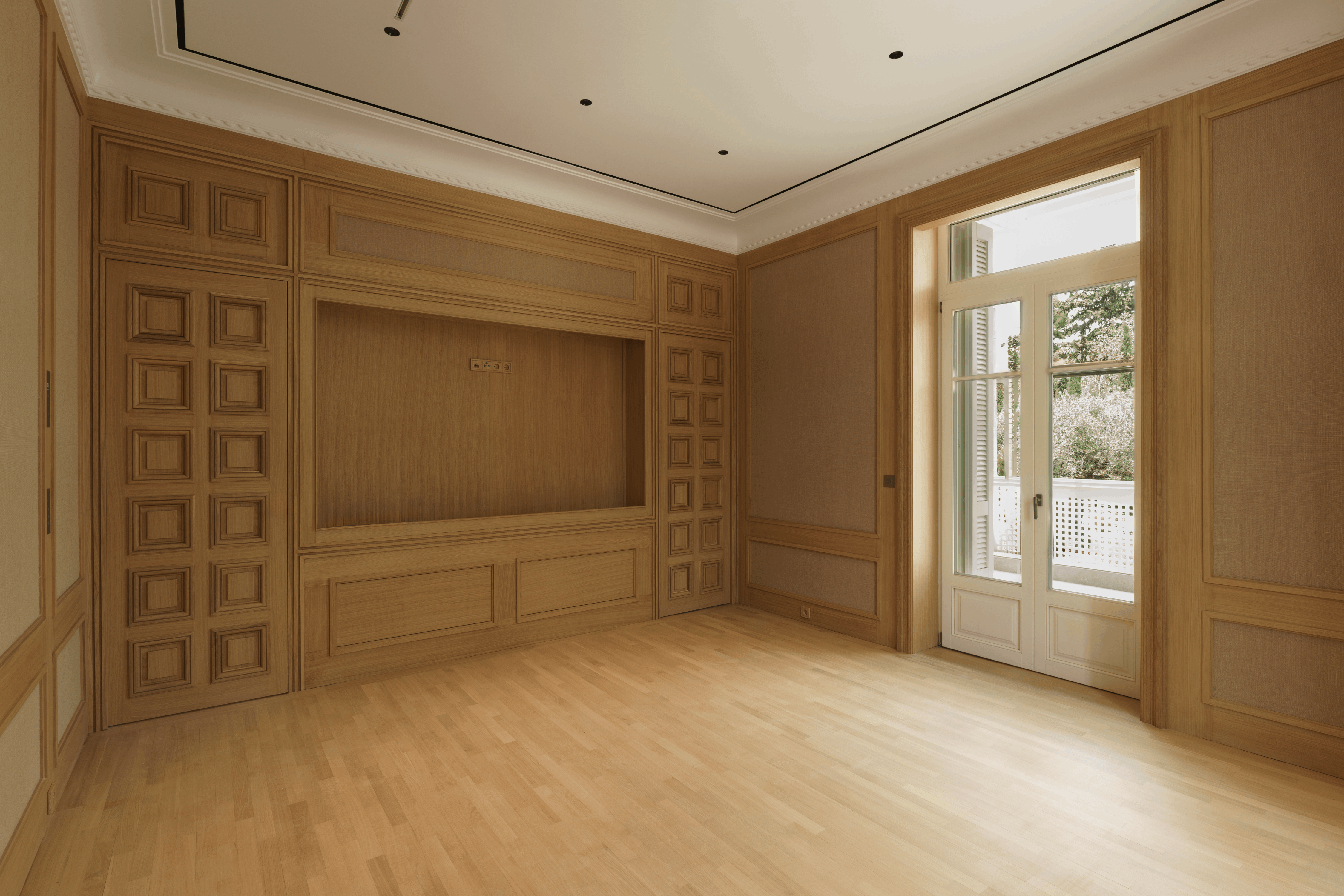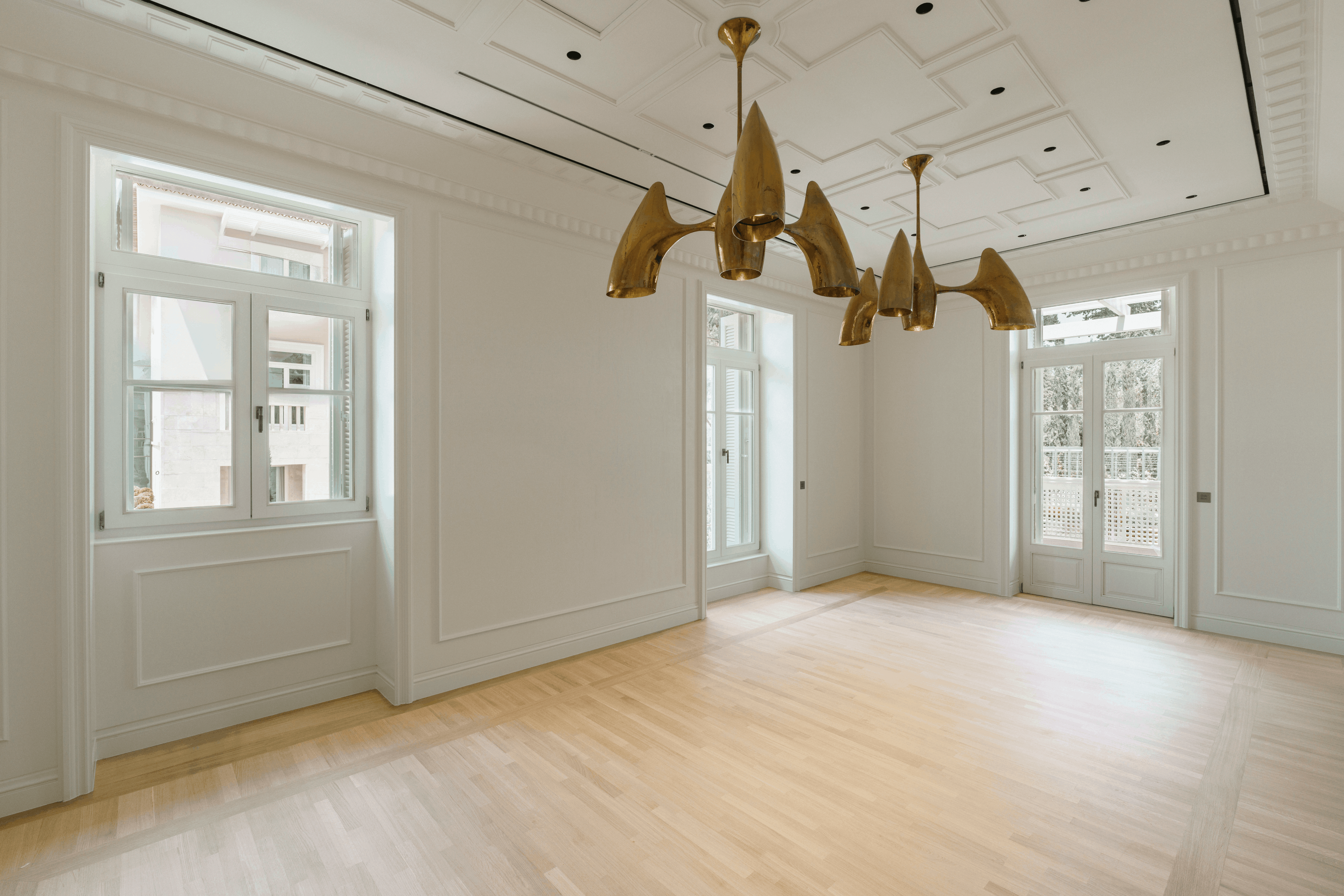 Special attention is given to material selection and to highlighting the building’s qualitative characteristics. The plaster decorative elements are meticulously restored, preserving their original character, while the wooden floors are reconstructed in accordance with the initial design. In the basement areas, existing terrazzo and mosaic finishes are carefully conserved and reinstalled, reinforcing the continuity of the building’s material identity. At the same time, modern technologies such as underfloor heating are introduced, enhancing both the energy performance and functionality of the residence without compromising its aesthetic integrity.