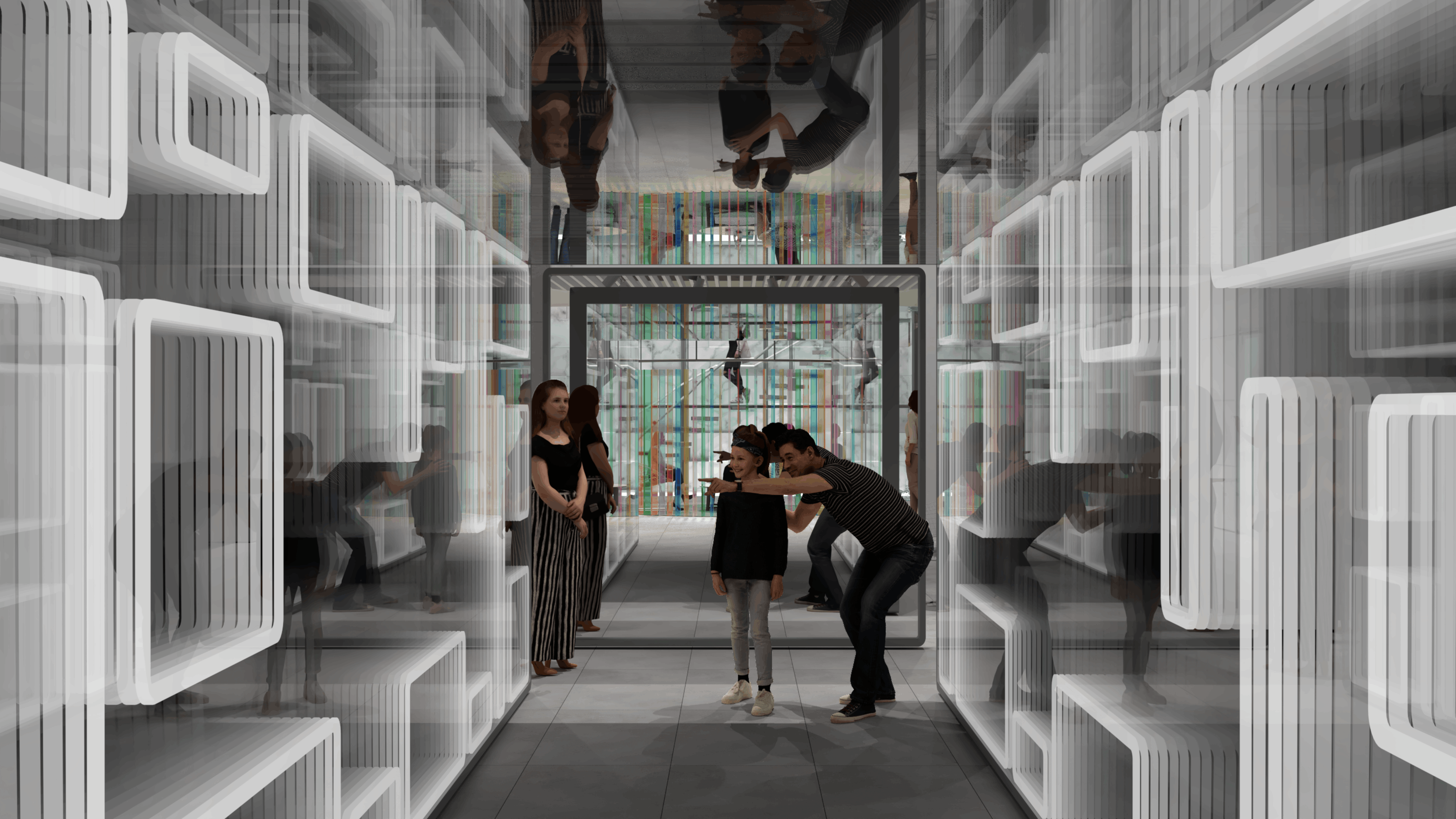 The dominant element of the design is the second shell, wrapping the building and protecting it from solar radiation and wind pressure. This external shell consists of glass brise-soleil, digitally printed with geometrical motifs, that resemble natural elements, such as tree trunks and branches. The digital print's pattern not only gives a vivid and playful appearance to the façade, but also lets the eye into the exhibition space, due to its density range.