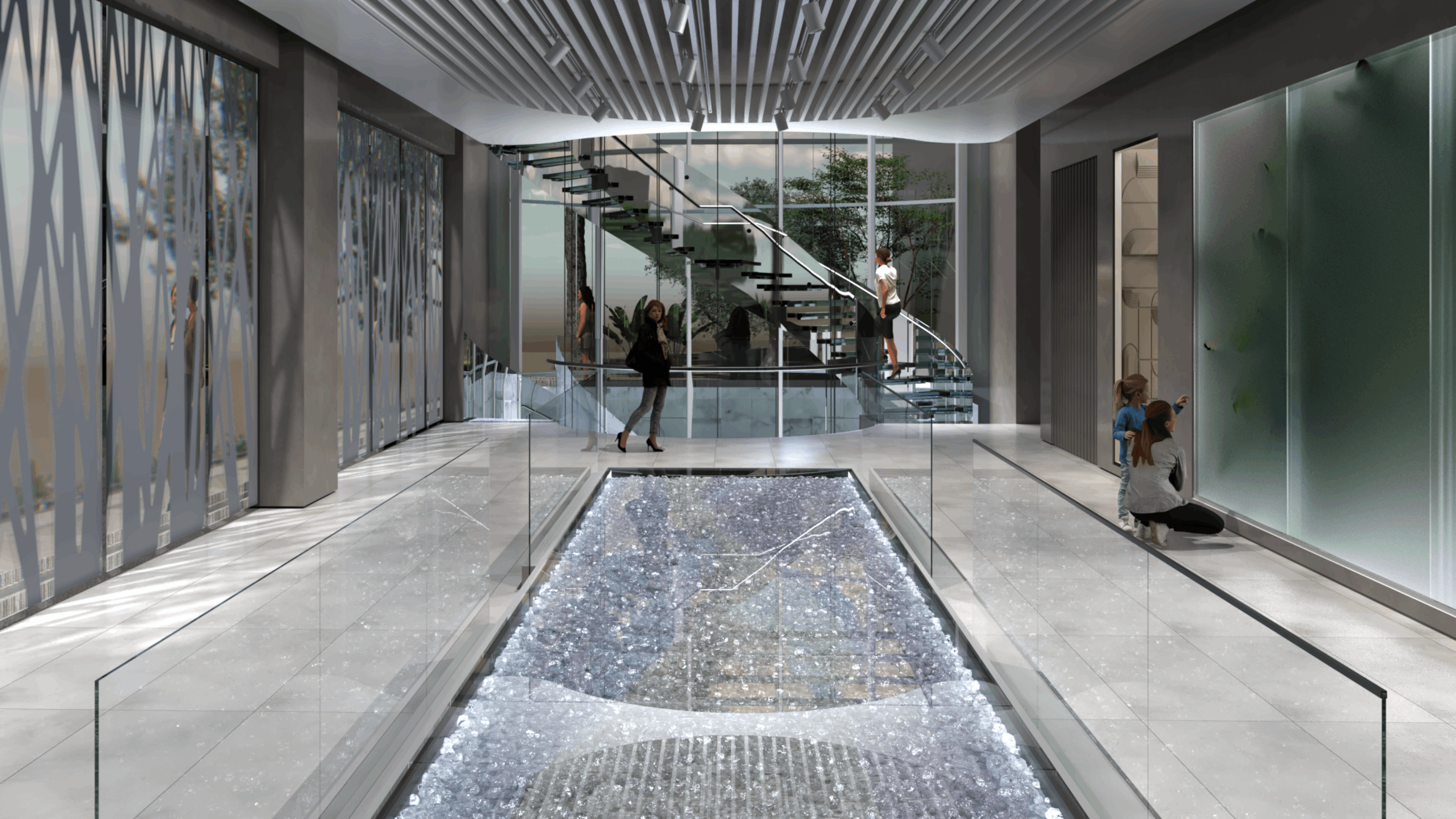 The interior maintains the exhibitional character, with glass wall claddings and the bold presence of the main glass staircase. The staircase stands out as the most impressive exhibit, with its high-end construction technology. Its sculptural elliptical shape gives the impression of an unfolding ribbon, creating a continuous flow between the levels of the exhibition spaces.