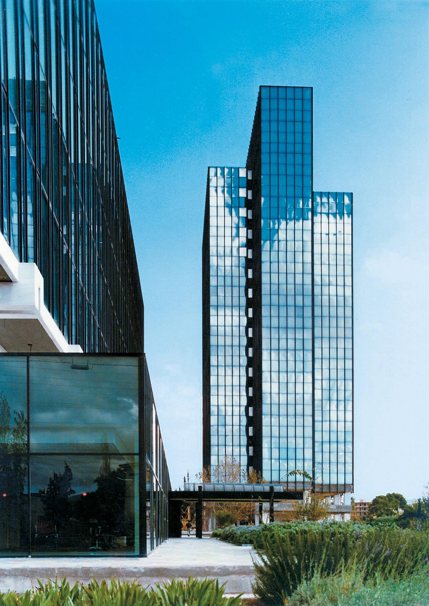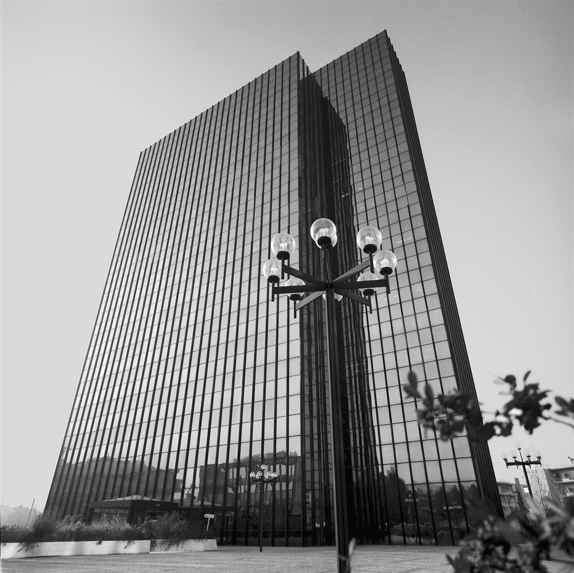 An advanced and innovative for the time technology of glasspanes was applied on this building, which aimed for maximum exploitation of the material. The glass, as cladding material (e.g. instead of marble or aluminum sheets) was suggested as the optimum solution for the style and identity of the high-rise building, to make it look as uniform and light as possible. Behind its uniform simplicity, the building has a clear interior configuration, with vertical circulation cores and auxiliary areas in the center.