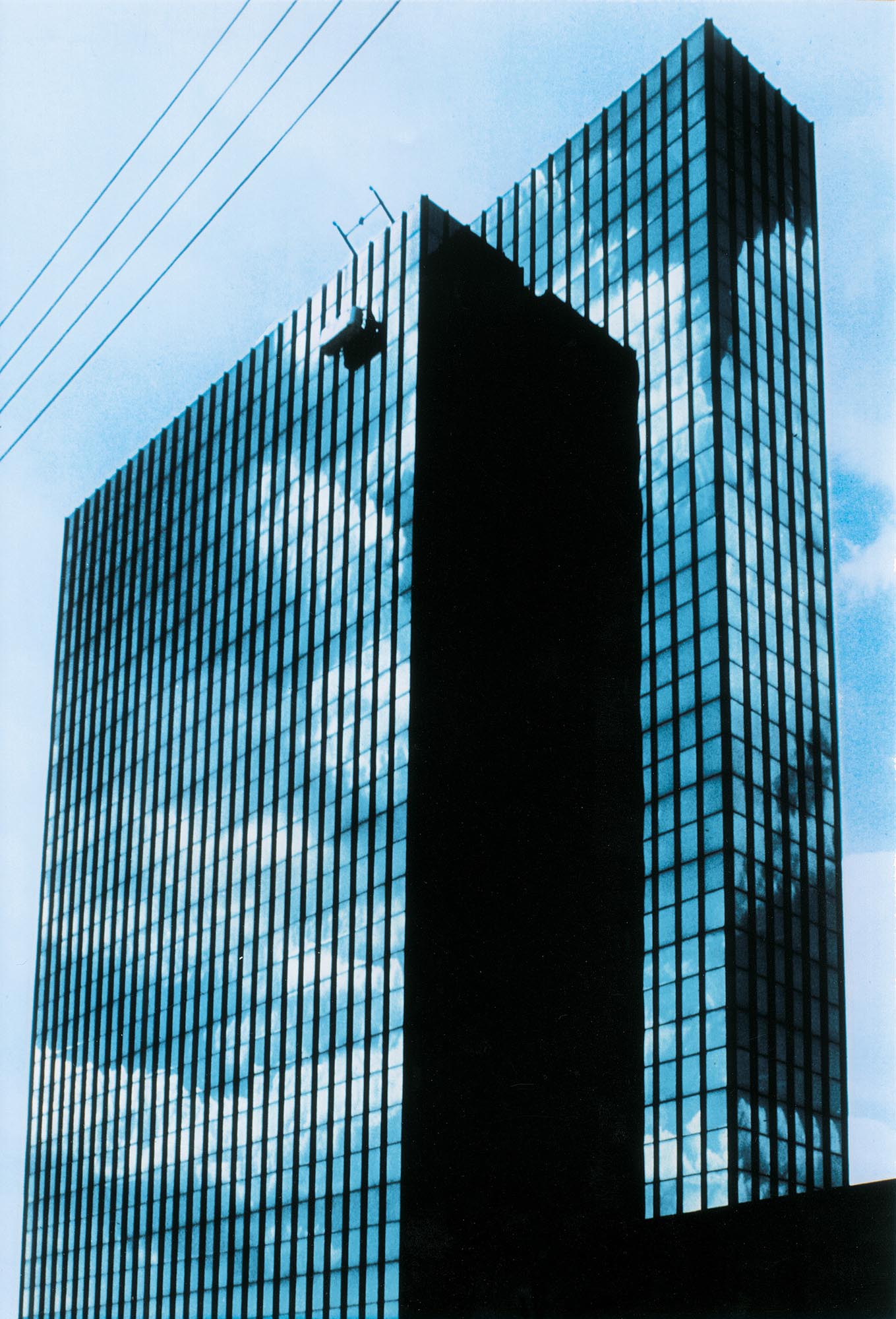 This prominent high-rise tower consists of three vertical rectangular prisms of different height, which are non-symmetrically set back along the axis of their narrow façades. All sides are formed by the uniform grid of reflective glass curtain walls.