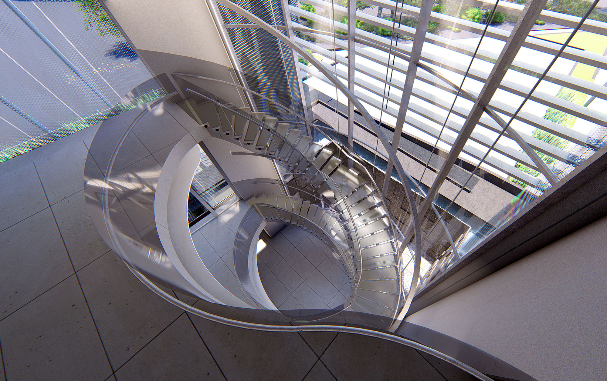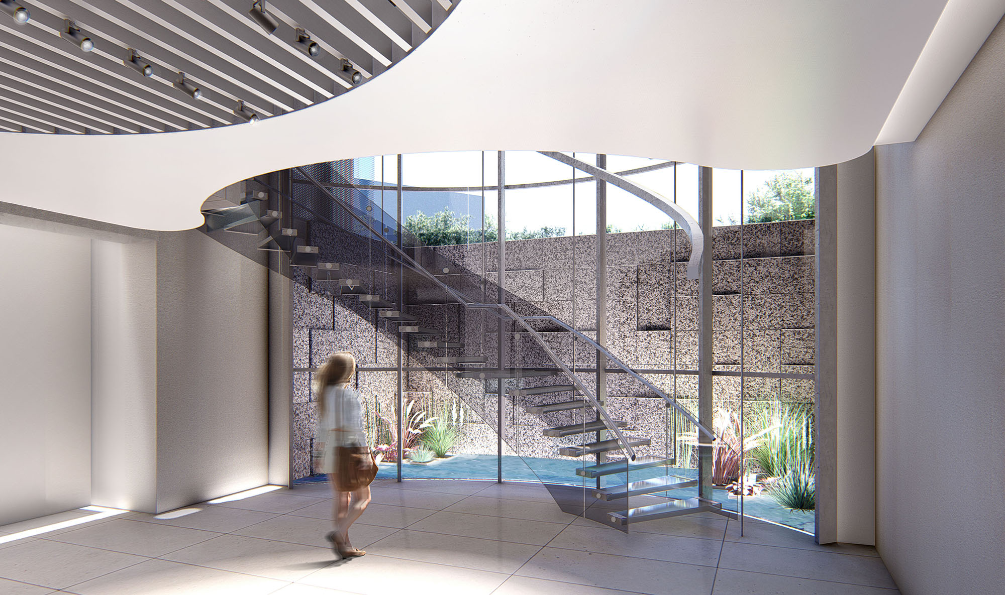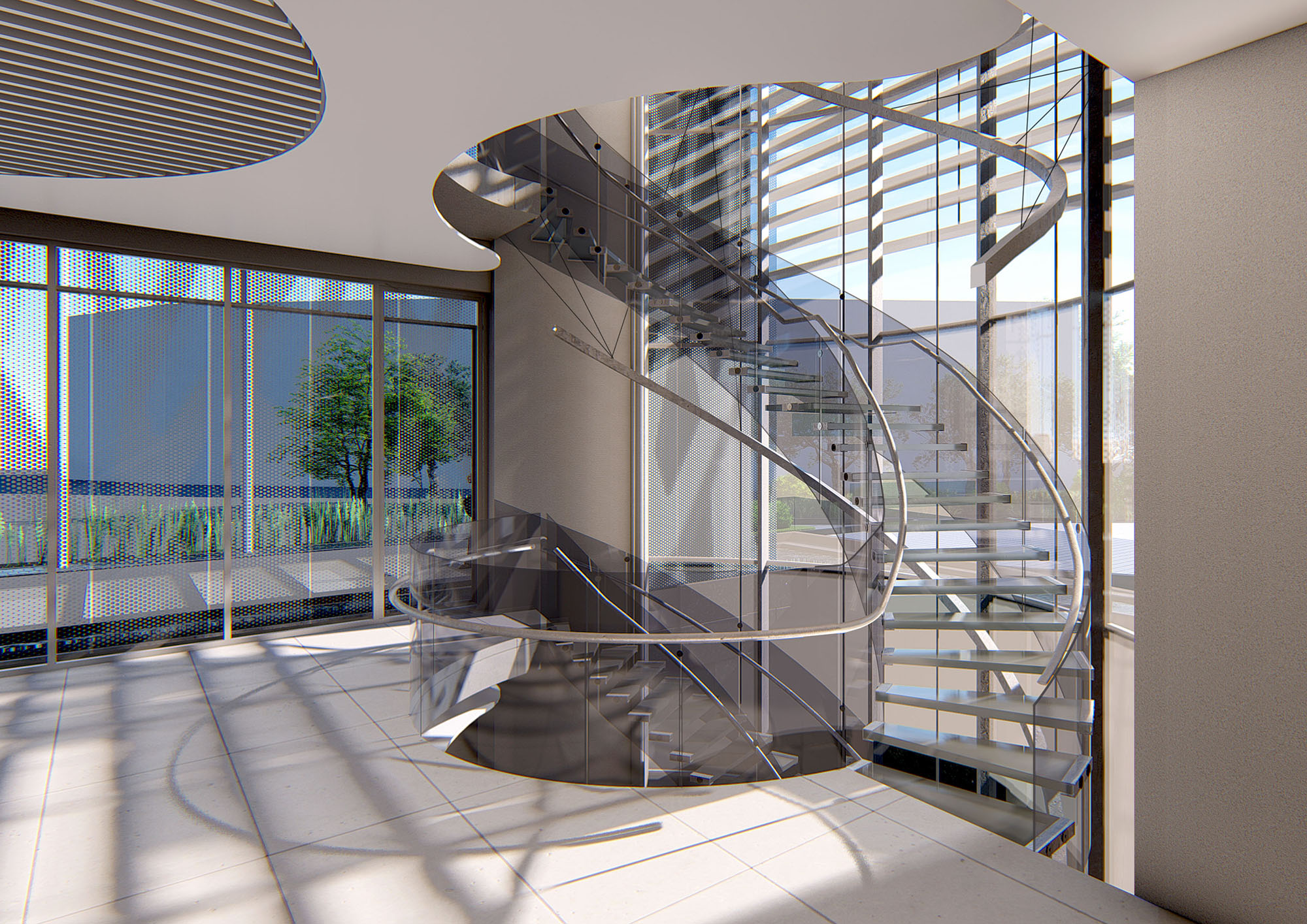 The interior maintains the exhibitional character, with glass wall claddings and the bold presence of the main glass staircase. The staircase stands out as the most impressive exhibit, with its high-end construction technology. Its sculptural elliptical shape gives the impression of an unfolding ribbon, creating a continuous flow between the levels of the exhibition spaces.