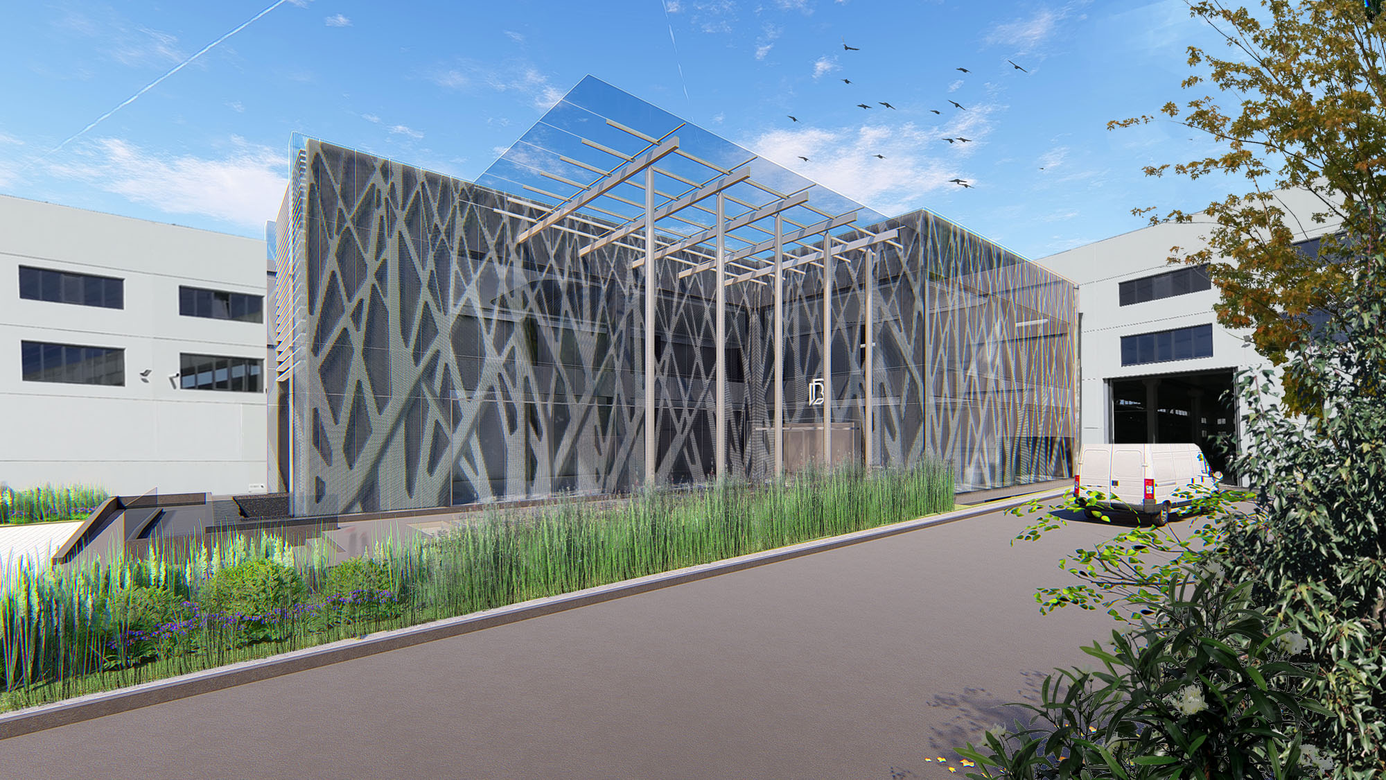 The dominant element of the design is the second shell, wrapping the building and protecting it from solar radiation and wind pressure. This external shell consists of glass brise-soleil, digitally printed with geometrical motifs, that resemble natural elements, such as tree trunks and branches. The digital print's pattern not only gives a vivid and playful appearance to the façade, but also lets the eye into the exhibition space, due to its density range.