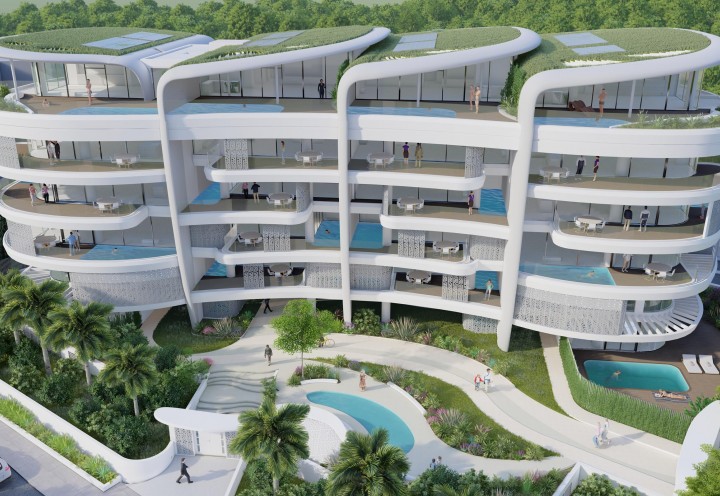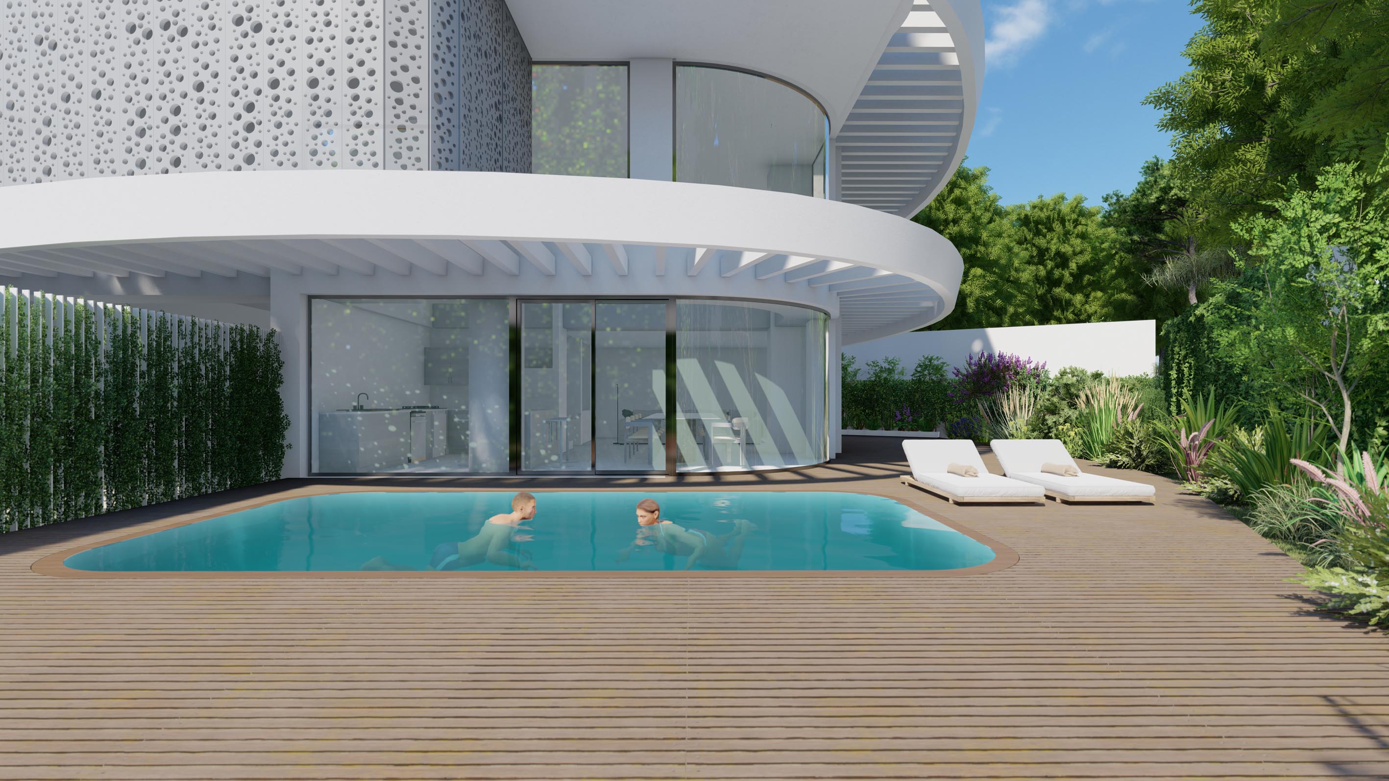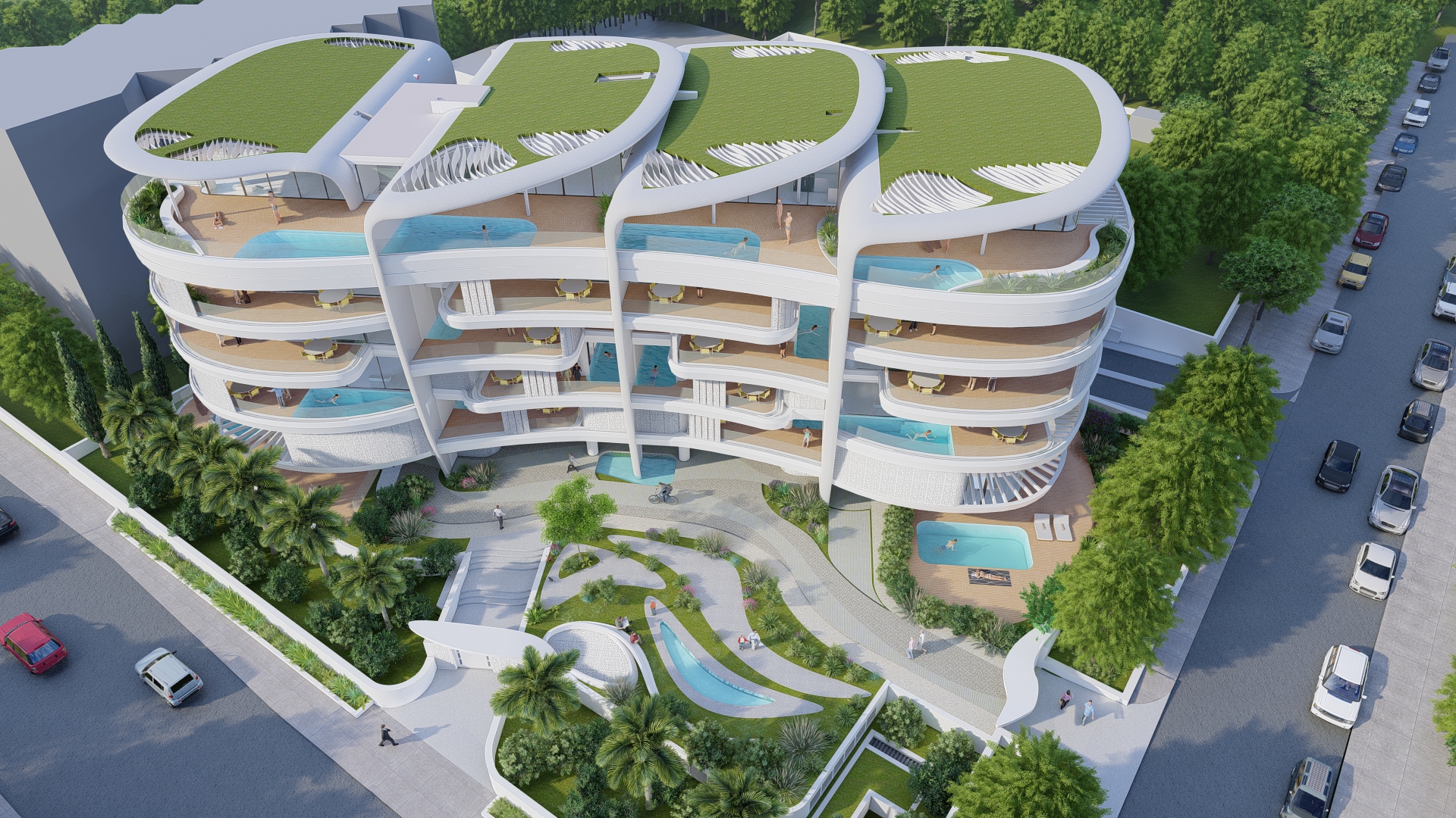 On the 3,000 sq.m. area of land in the Evryali area of the Municipality of Glyfada on Poseidonos Avenue, it is prescribed to build a complex of luxury residences, 16 apartments of which 10 are upper floors with two stairwells and two basements. Each apartment has a private swimming pool on the terrace. On the ground floor apartment are intended to have personal use of a garden with a private swimming pool.