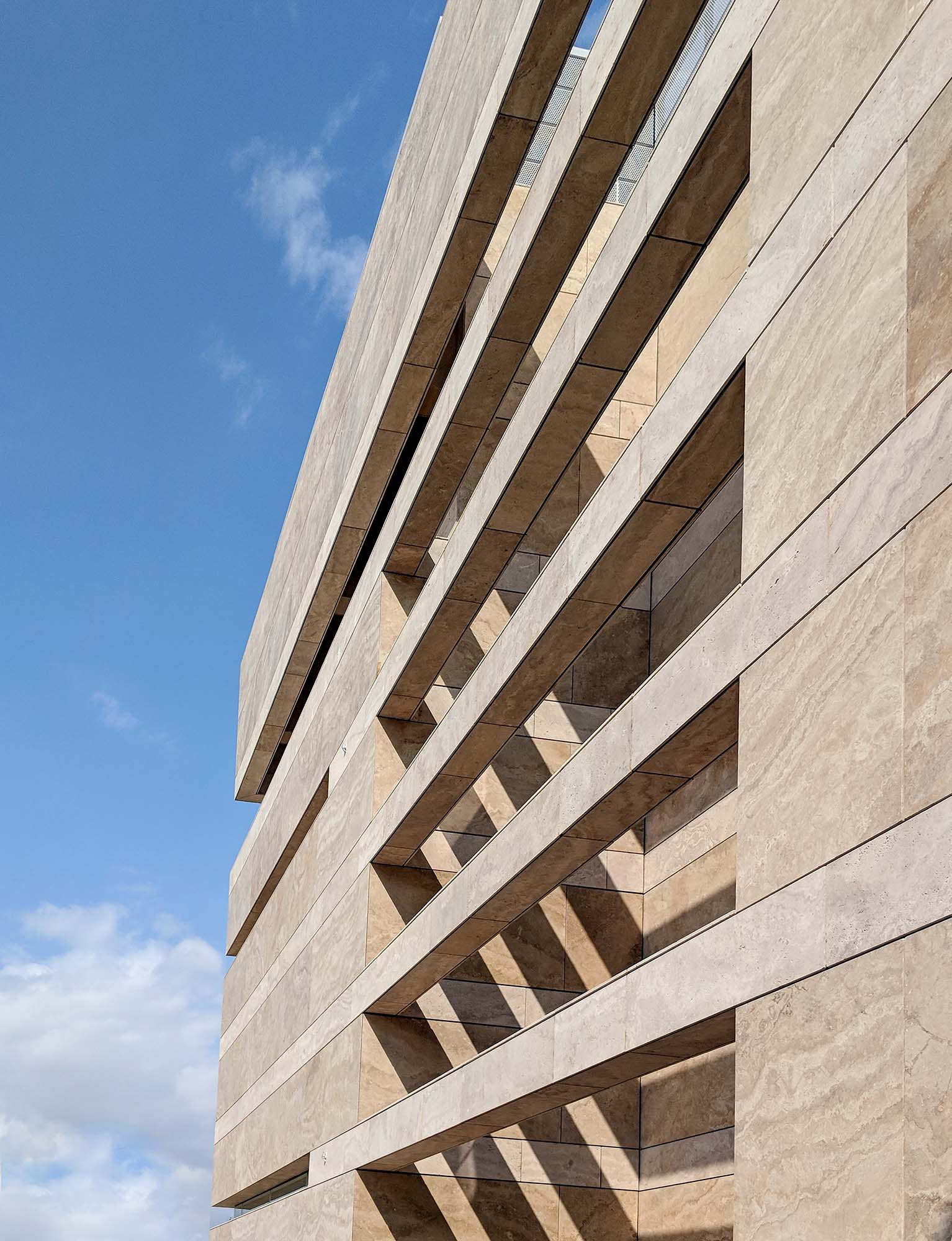 The storeys above were designed in recess from the outline of the listed building, forming a distinguishable volume with a rather minimal architectural style. The shell of the new wing is clad by alternating large and narrow marble plates with integrated clerestory windows in form of slots that disperse diffused natural light into the exhibition areas.