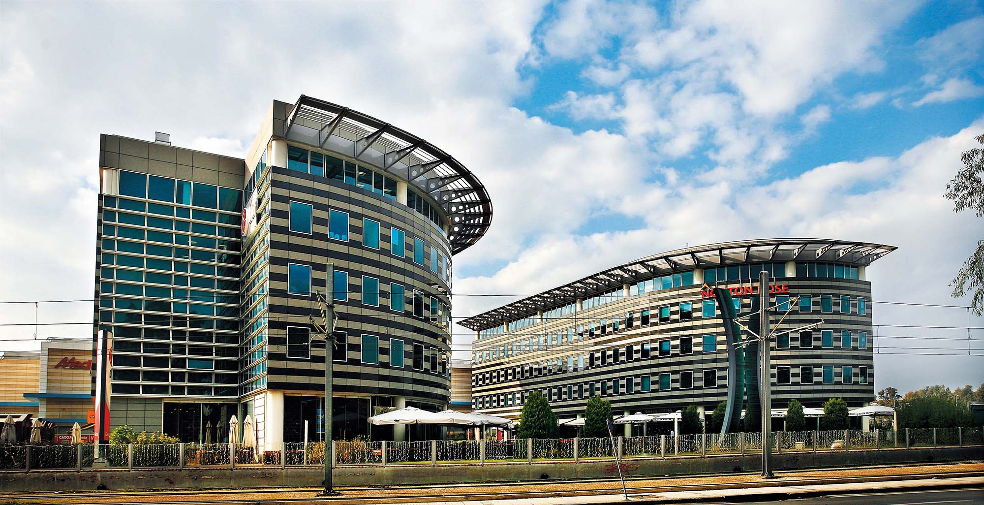 The two office buildings were designed with the sculptural particularity of a semi-circular entrance form, an open crucible that invites visitors to enter inside the complex. At the same time, the elongated arrangement of the façades and the mirrored repetition of the volumes, which stand over a unified underground base, create the impression of a passage-like building ensemble, a “gate”, to the commercial and recreation facilities at the back.