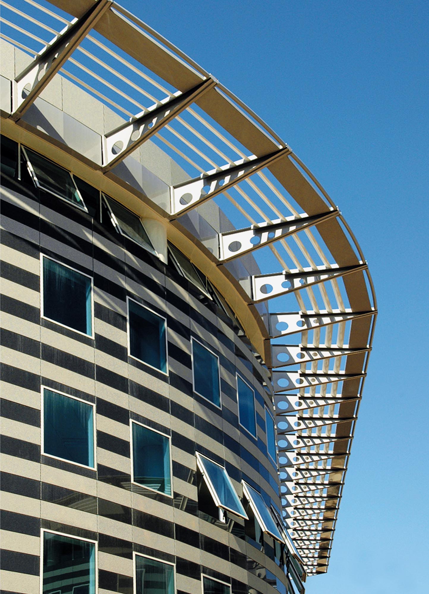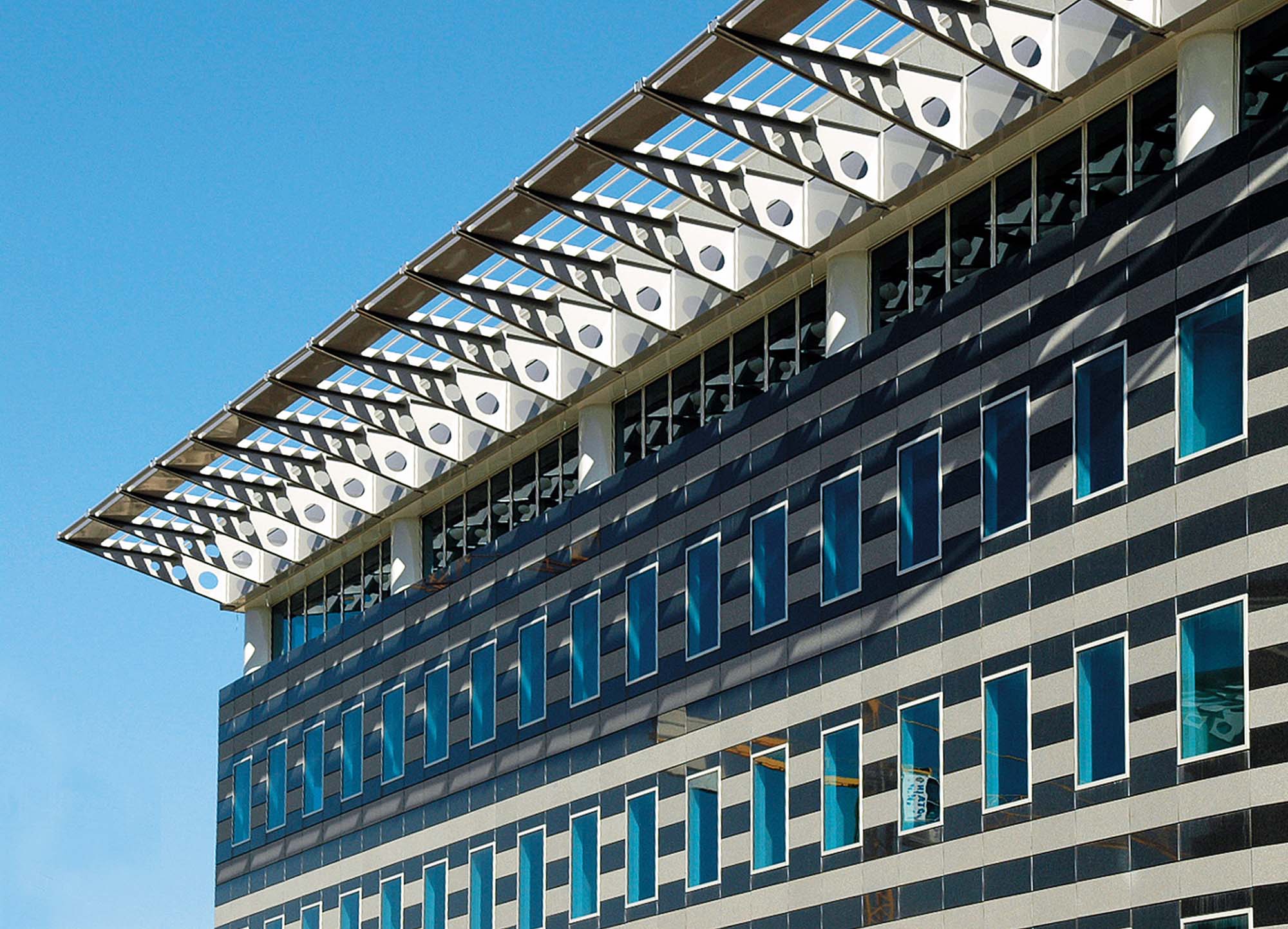 Glass is chosen as the main material of the façade on the ground level as well as on the last floor, while the visible round columns are covered with white aluminum. The intermediate three storeys are clad with alternating continuous zones of polished and sandblasted black granite. The vertical surfaces of the corner cuttings are covered completely by glass curtain walls and white horizontal aluminum louvers. Similar shading devices project from the upper surrounding beams of the building frame. They were placed to underline the crowning of the buildings and accentuate aesthetically the upwards termination with a lighter perforated outline.