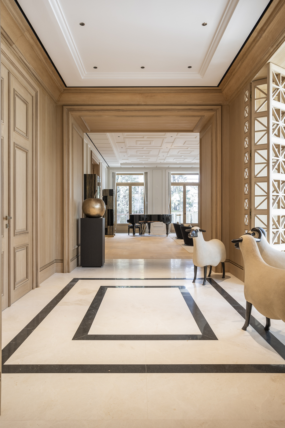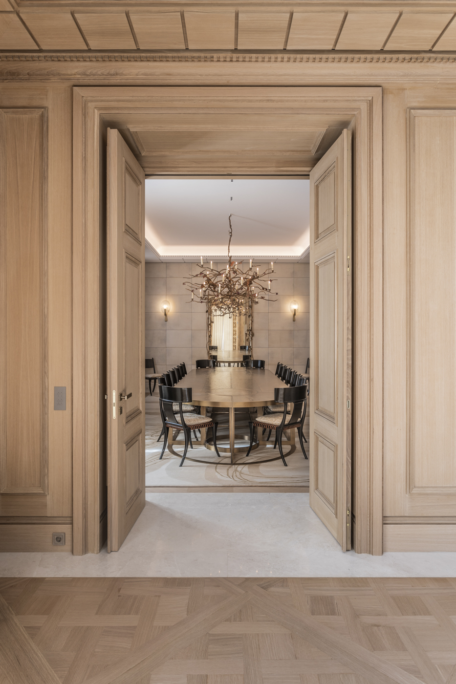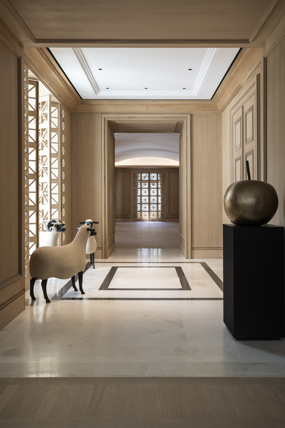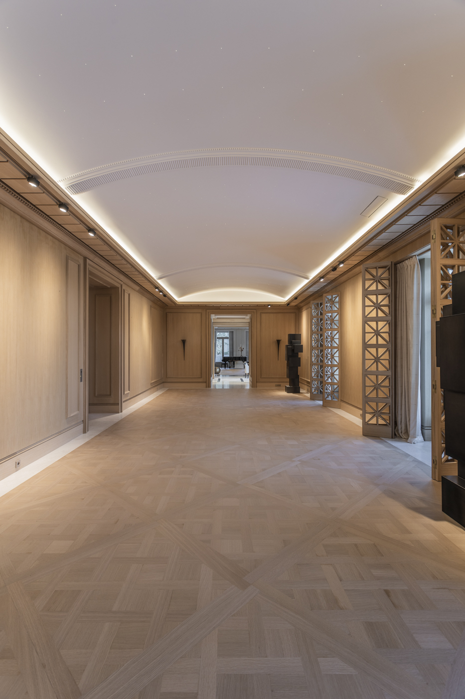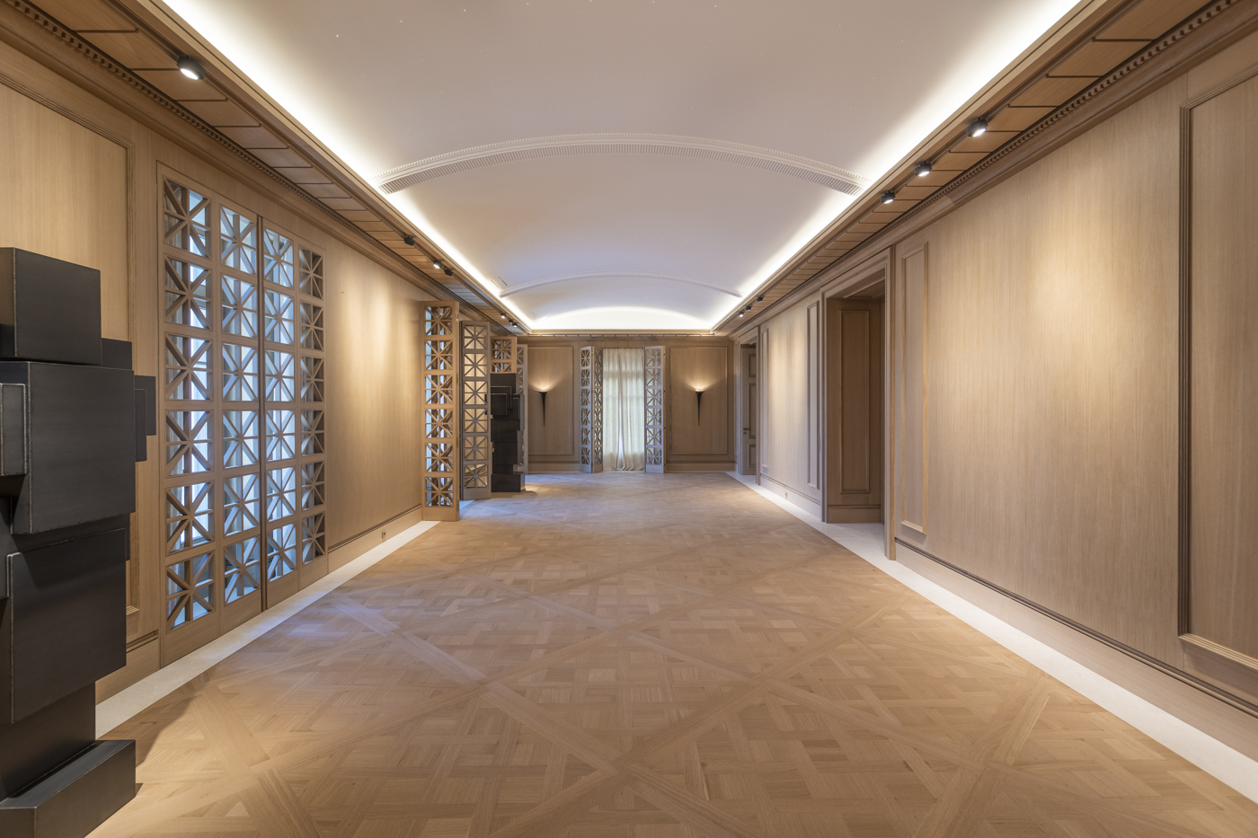 At this stage, the interior of the entrance and reception areas of the intermediate level (upper ground level) has been completed. The photographic material shows this stage of sitework. A systematic effort was made in the floors, ceilings, and claddings to shape the interior spaces in a way that refers to the features and decoratives of the neoclassical building without the use of unnecessary or excessive ornaments. Finally, great care was given to careful and very discrete integration of HVAC and lighting systems.