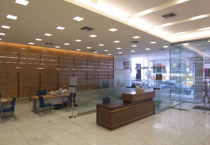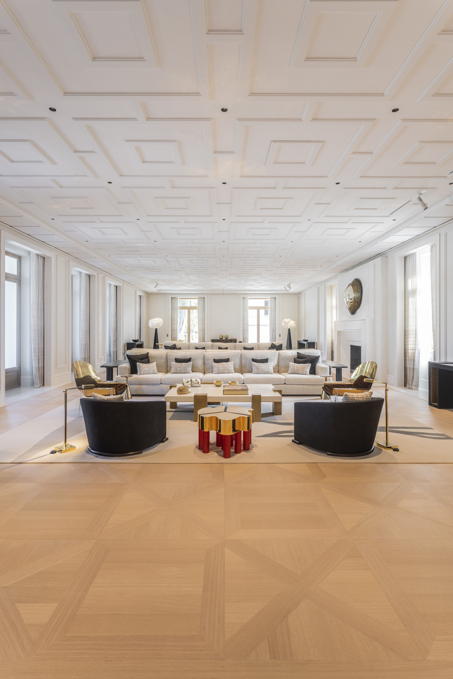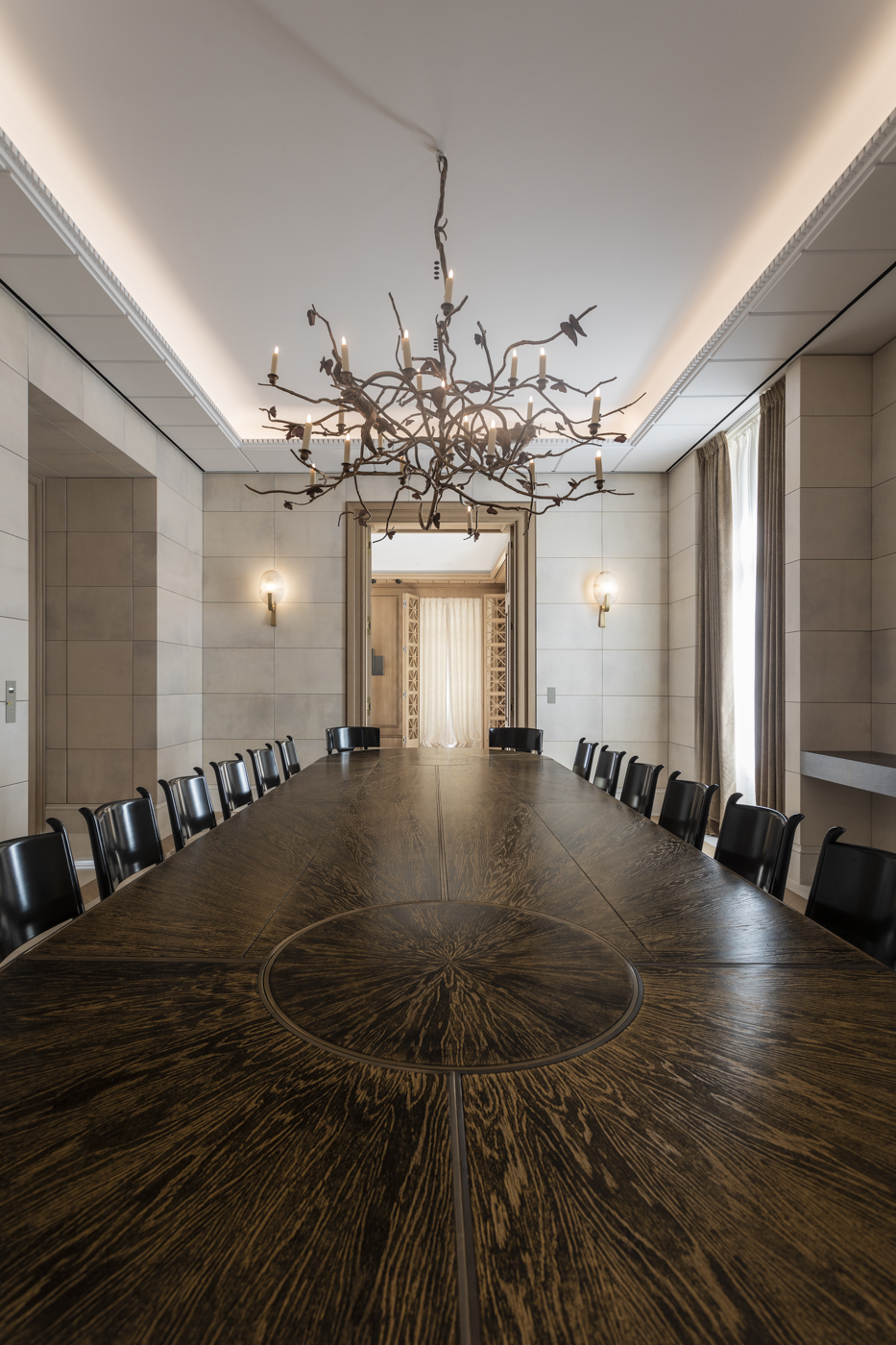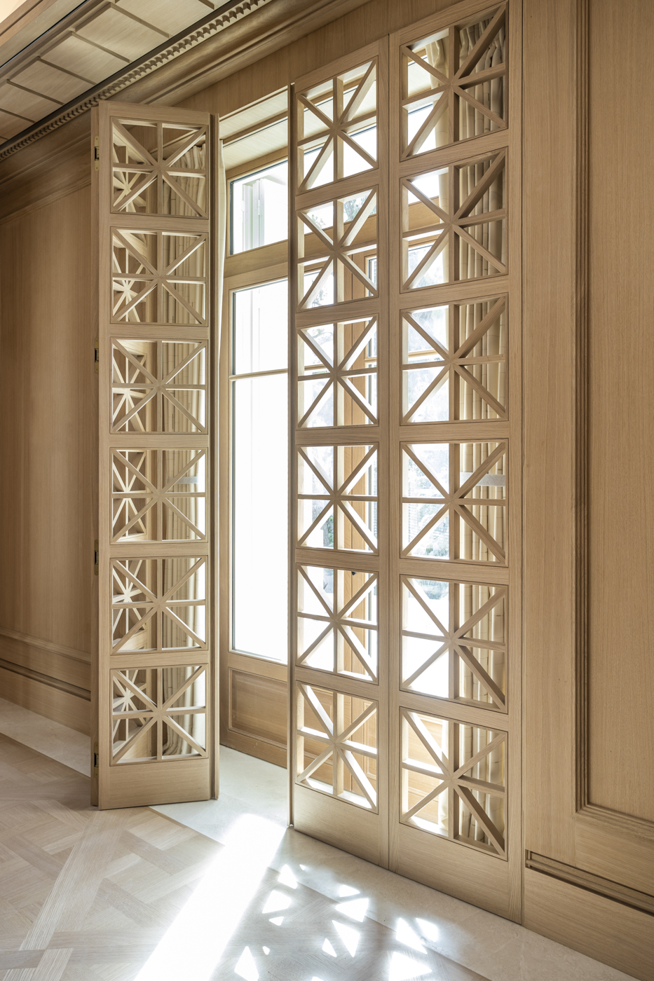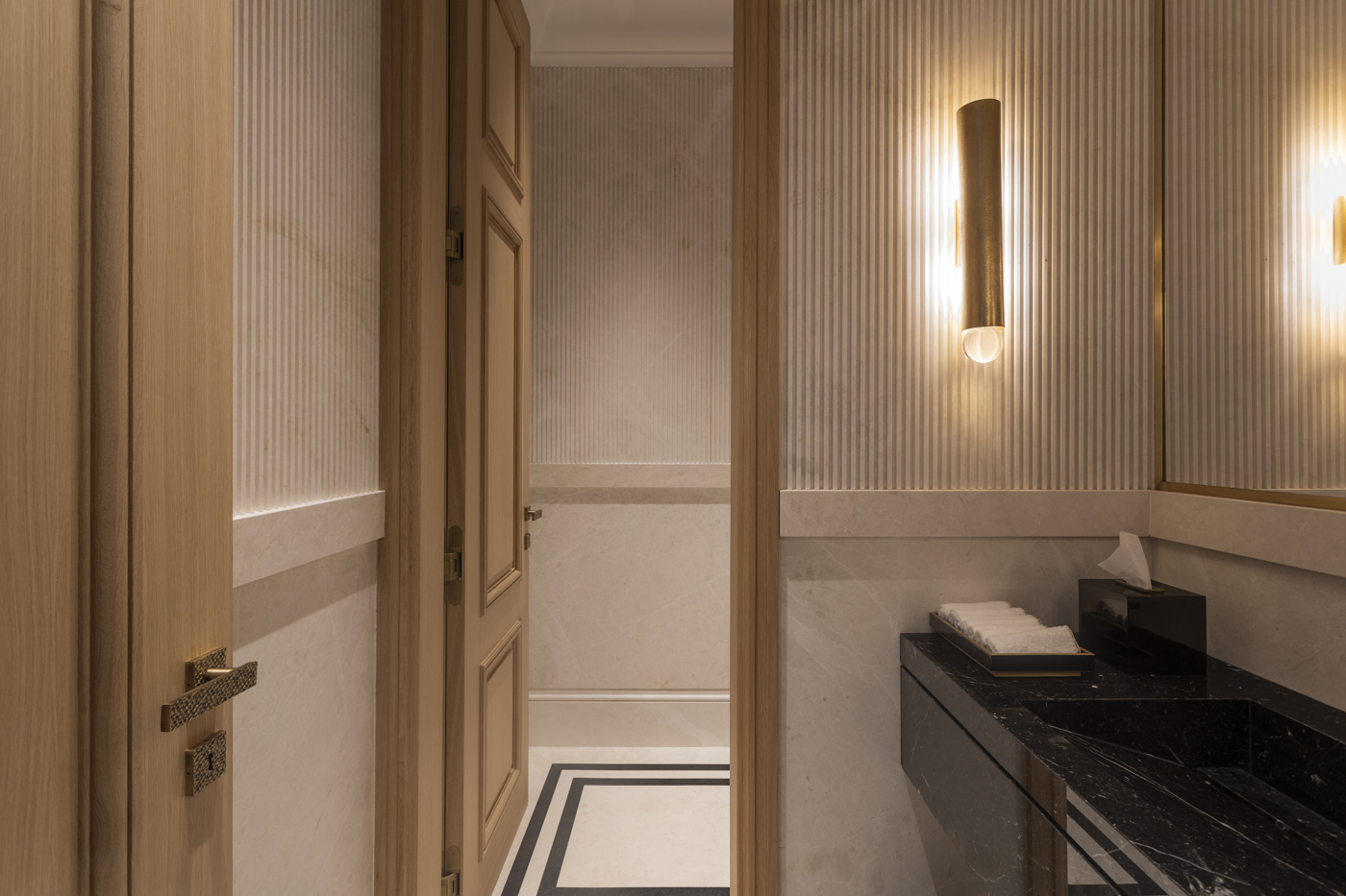 At this stage, the interior of the entrance and reception areas of the intermediate level (upper ground level) has been completed. The photographic material shows this stage of sitework. A systematic effort was made in the floors, ceilings, and claddings to shape the interior spaces in a way that refers to the features and decoratives of the neoclassical building without the use of unnecessary or excessive ornaments. Finally, great care was given to careful and very discrete integration of HVAC and lighting systems.
