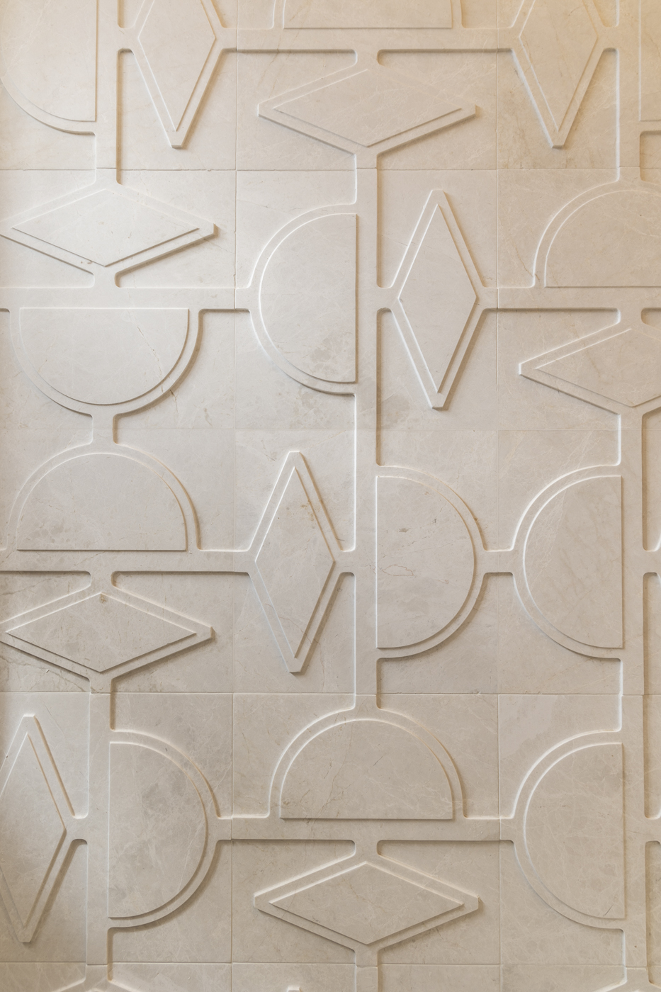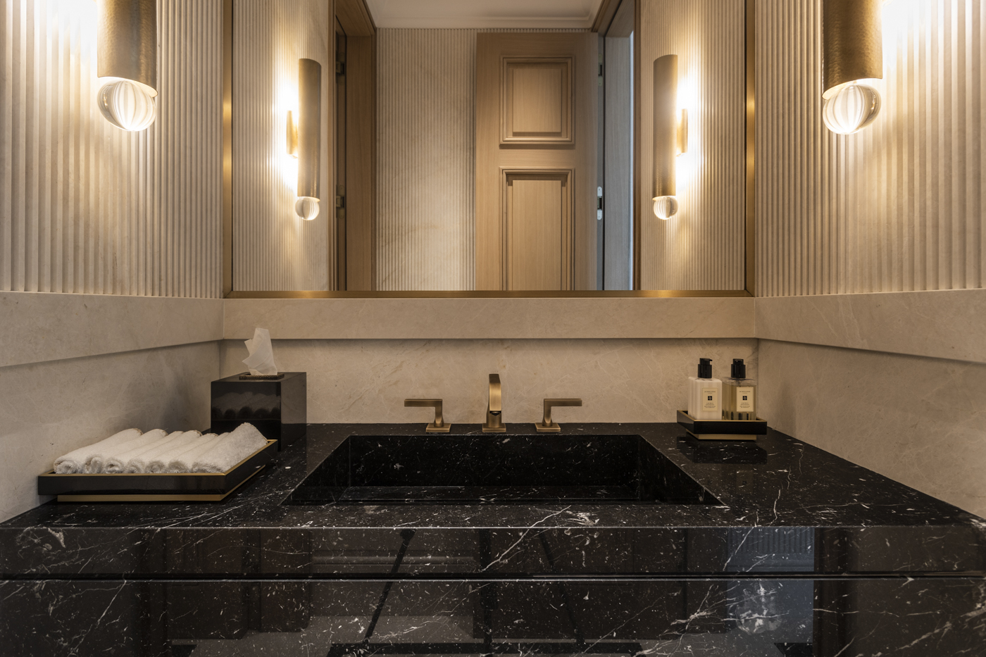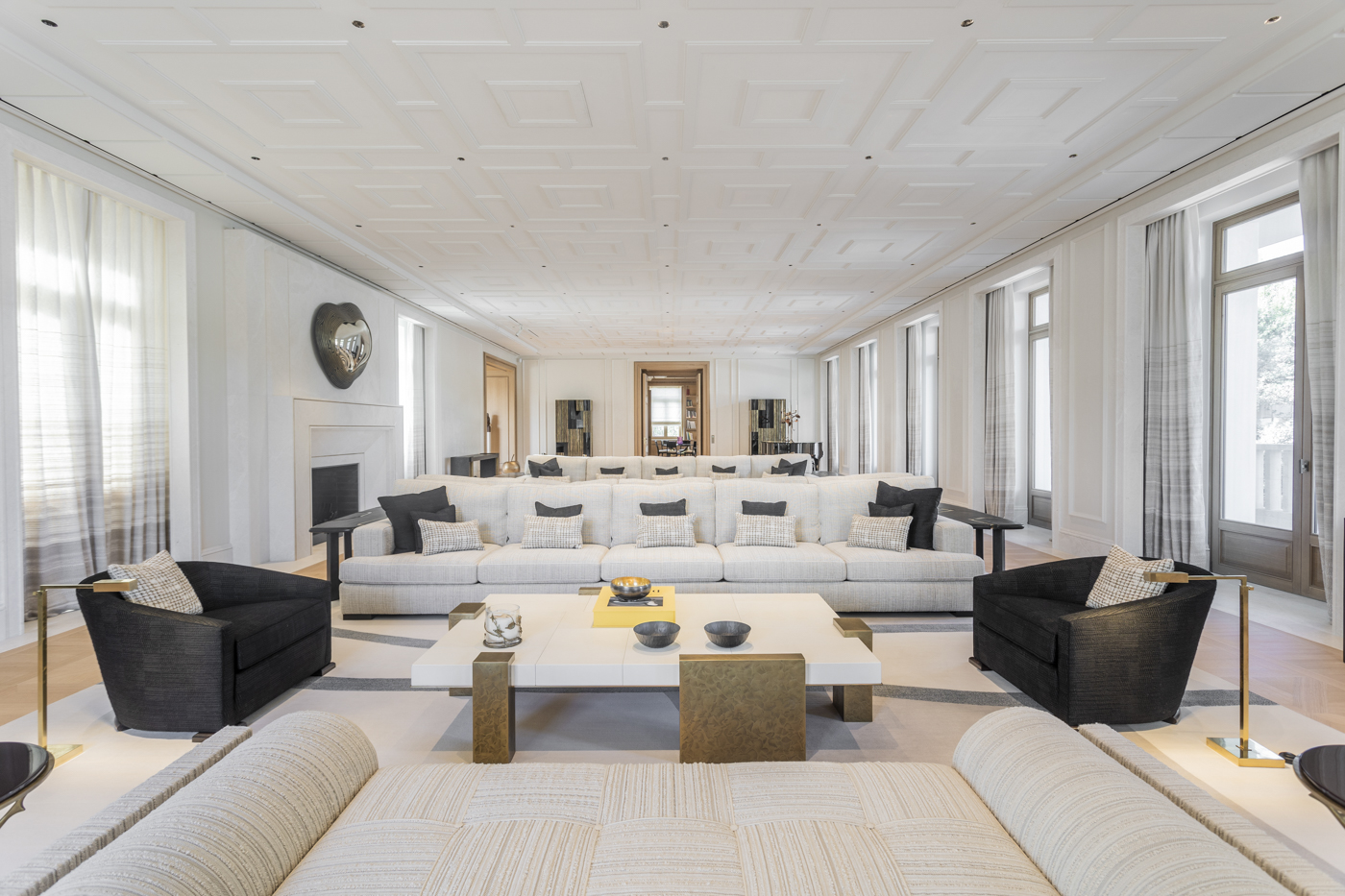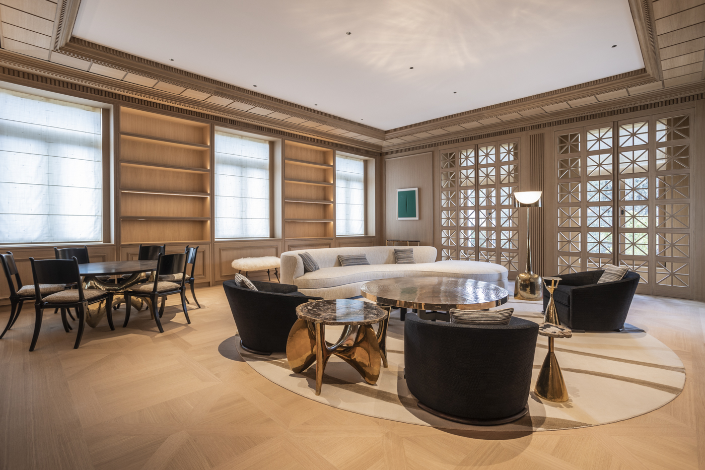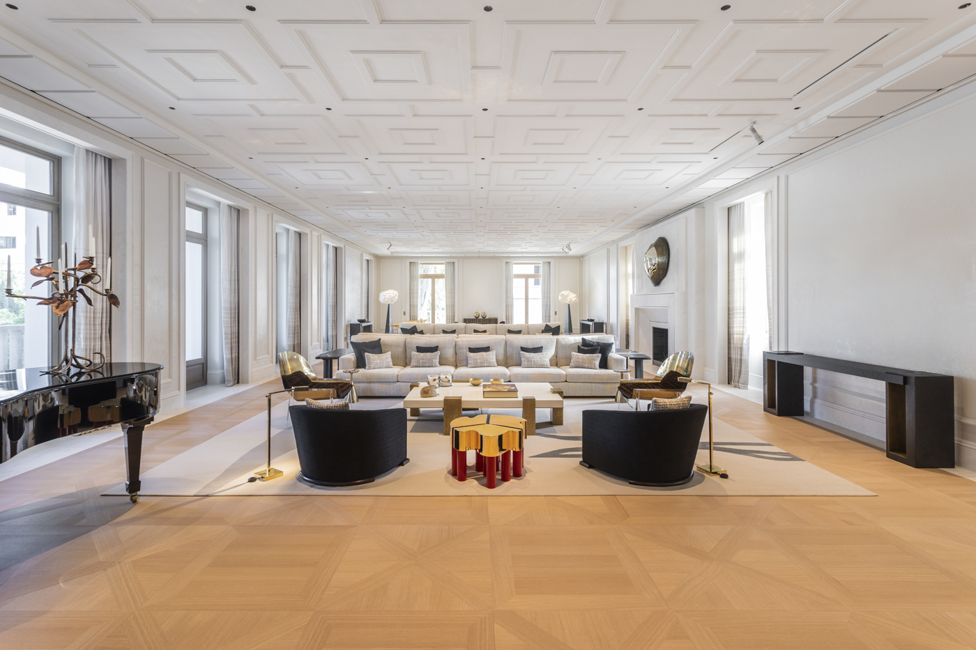 At this stage, the interior of the entrance and reception areas of the intermediate level (upper ground level) has been completed. The photographic material shows this stage of sitework. A systematic effort was made in the floors, ceilings, and claddings to shape the interior spaces in a way that refers to the features and decoratives of the neoclassical building without the use of unnecessary or excessive ornaments. Finally, great care was given to careful and very discrete integration of HVAC and lighting systems.