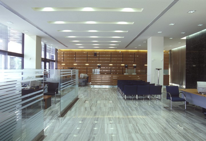 Polygonal lamps with diffused elastic membranes were suspended under the perforated metal ceiling. The choice of geometry subtly relates them to the checkered patterns of the floor thus creating a common architectural vocabulary.