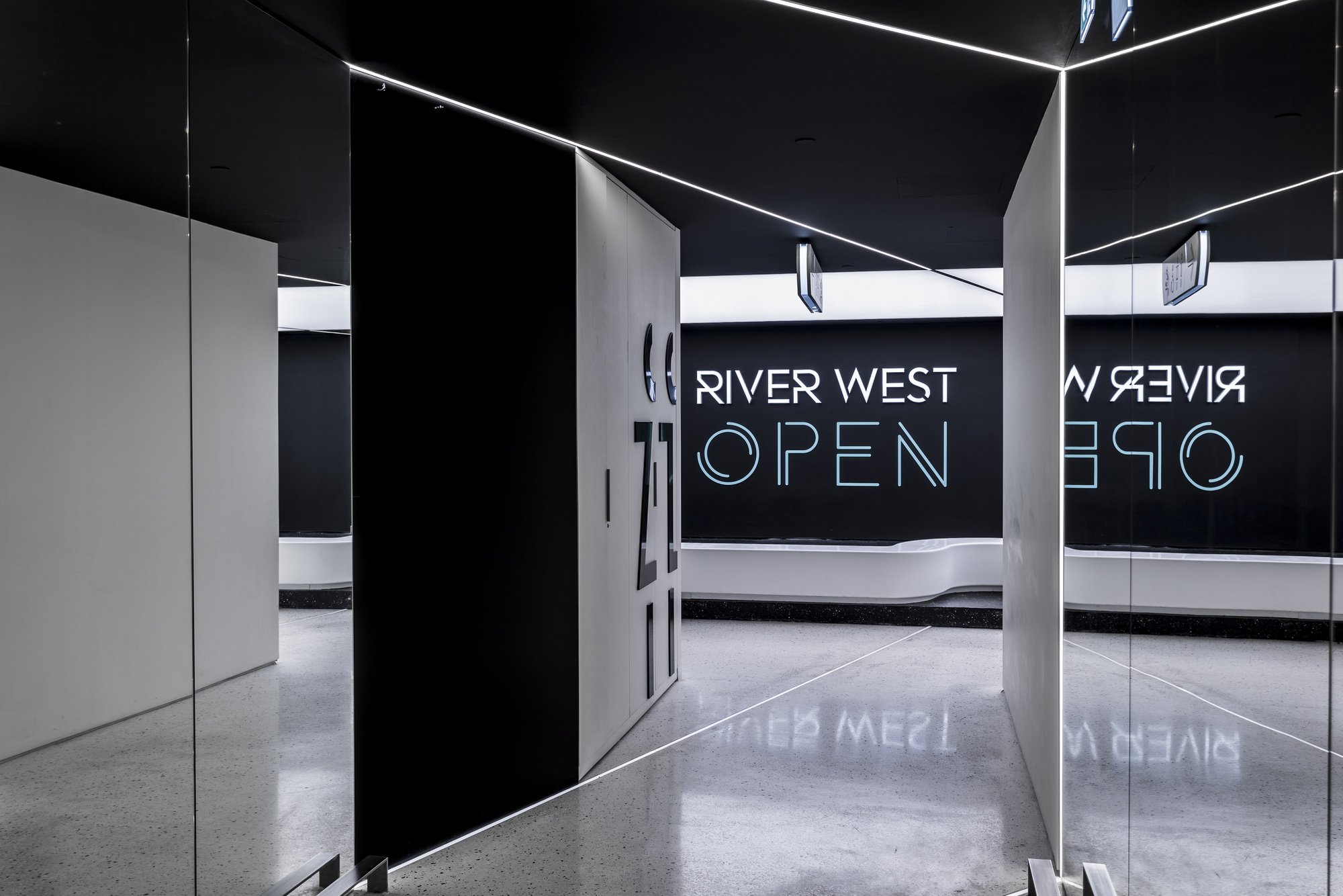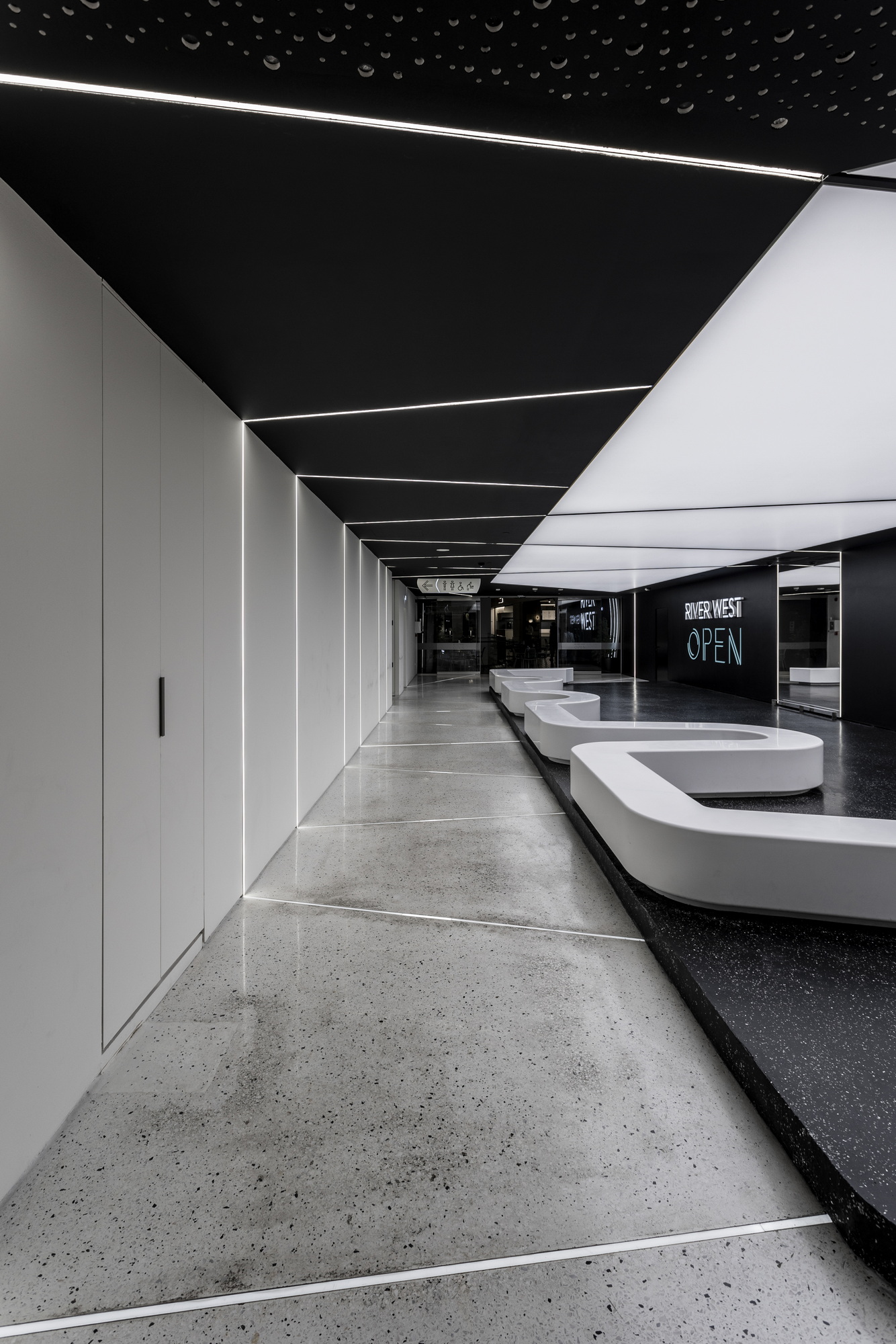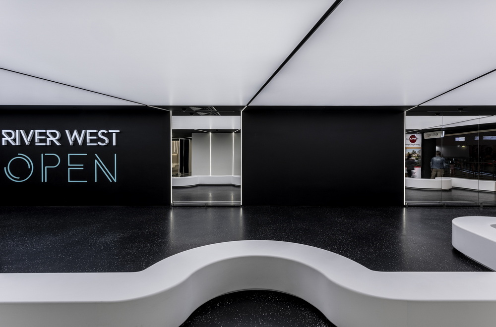 The inner contour and the entire elevated part surrounding the elastic roof is covered in black, thus emphasizing the curved outline of the luminous structure. Near the elevators hangs a continuous curved lighting strip in the form of a monopod extending on either side of the transition zone that signals and hints at the new intervention inviting visitors to the Riverwest Open.