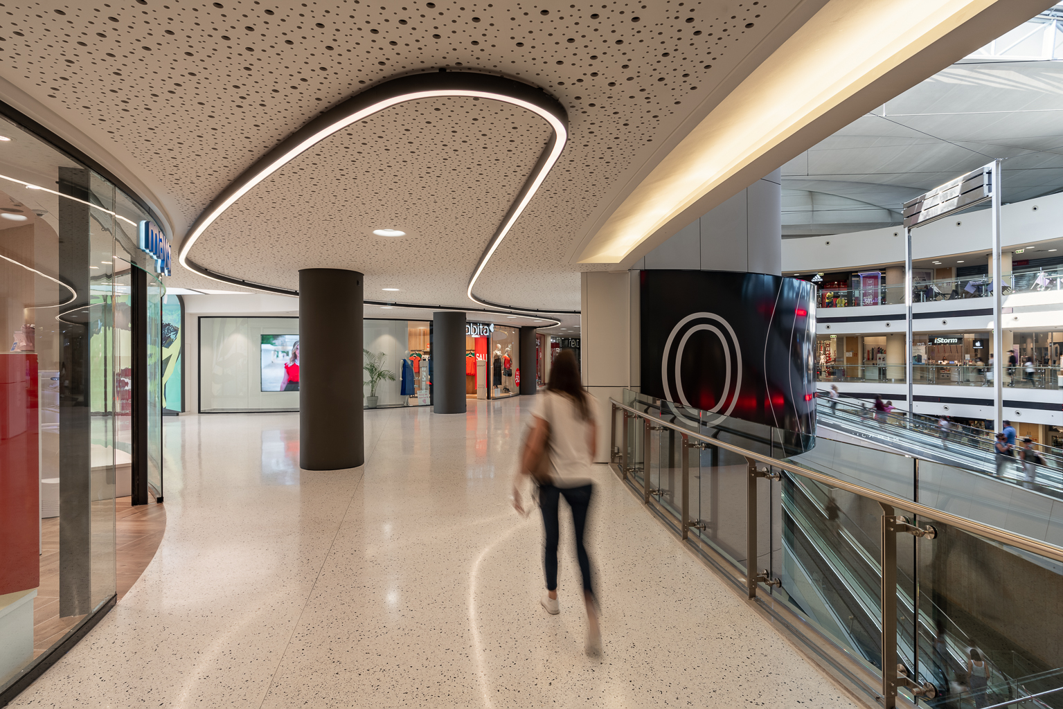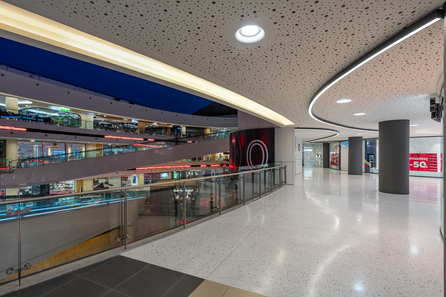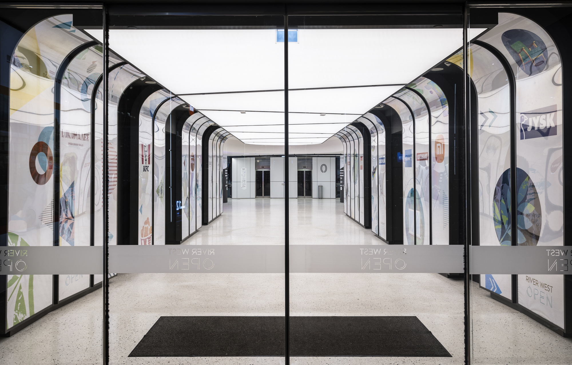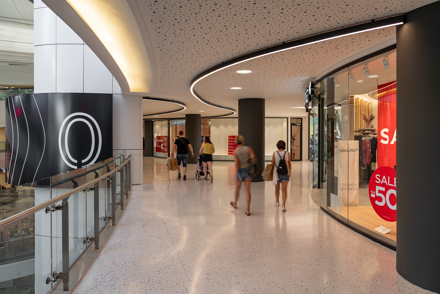 The lateral surfaces of the stores, which are placed on either side of the corridor, are softened, turning the glass windows into a curve, thus facilitating the flows and widening the transition zone in the meanwhile. Vertical lightboxes are placed next to the corridor, which illuminate the space and carry signage related to the extension's stores or display advertising and informational messages. Similarly, for visitors walking at River West Open, light boxes have been placed on the ground floor and stickers (environmental graphics) on the upper floor to facilitate the marking and promotion of the shops.