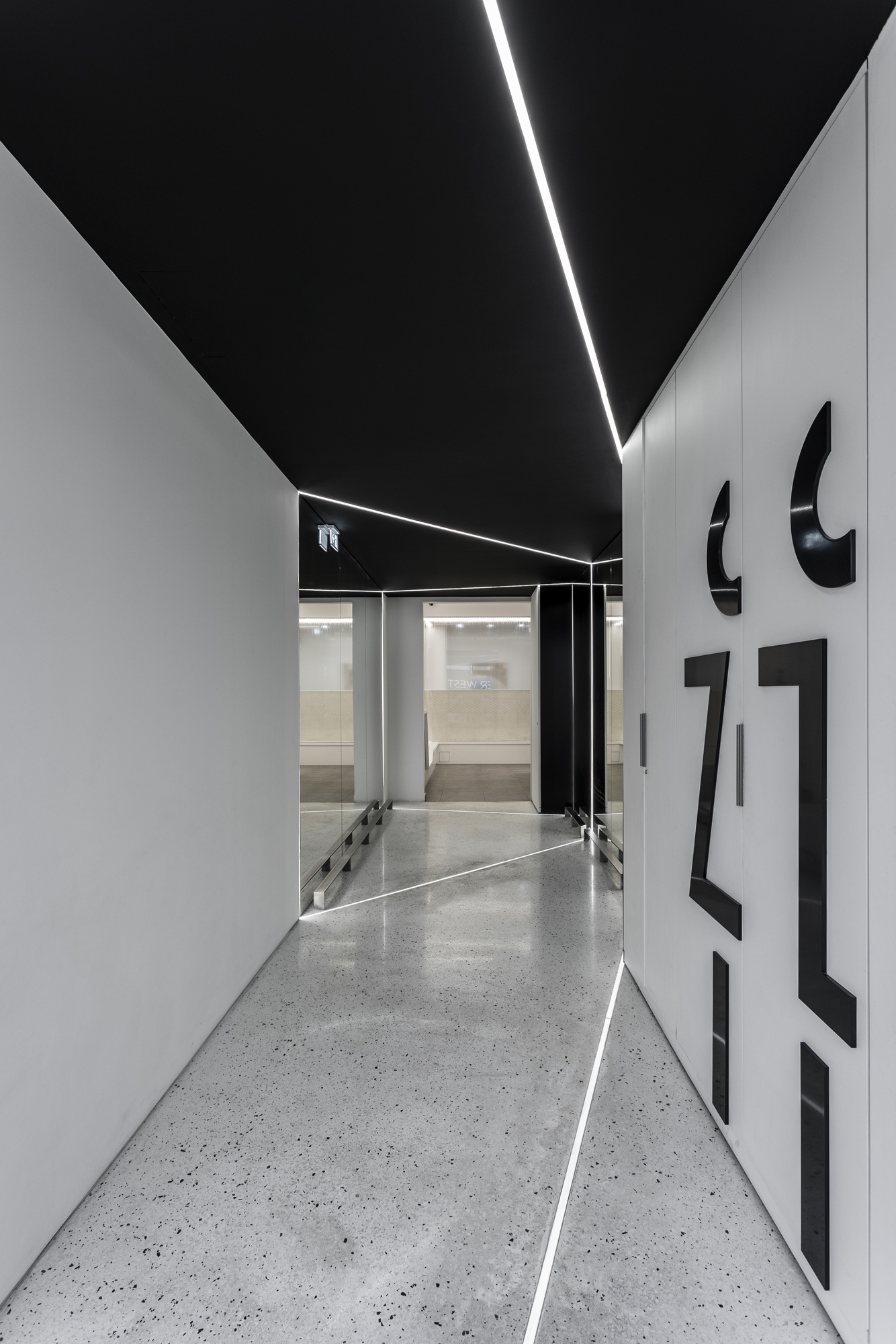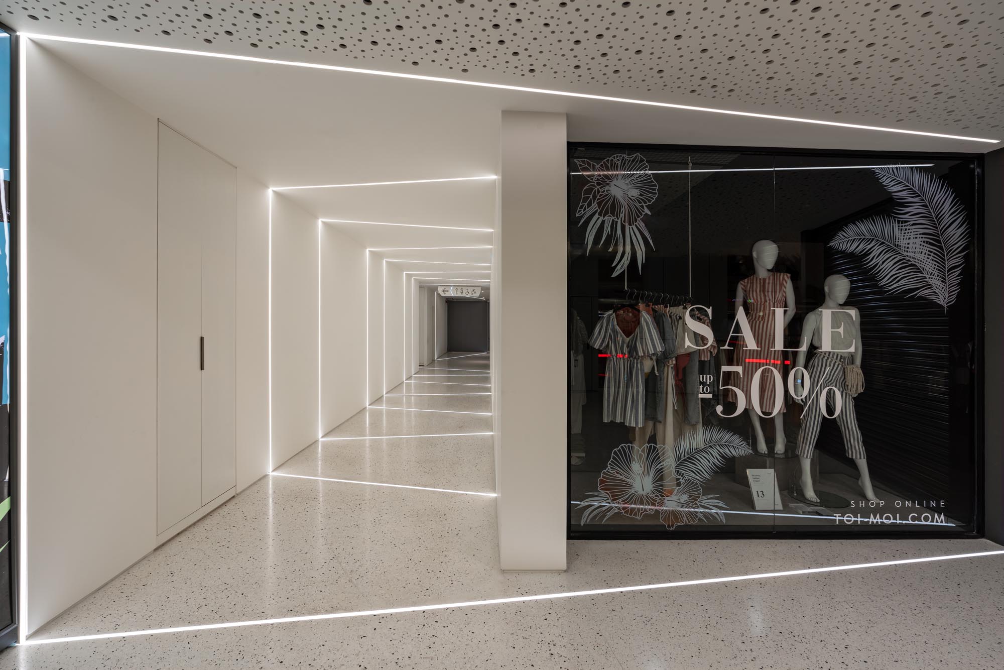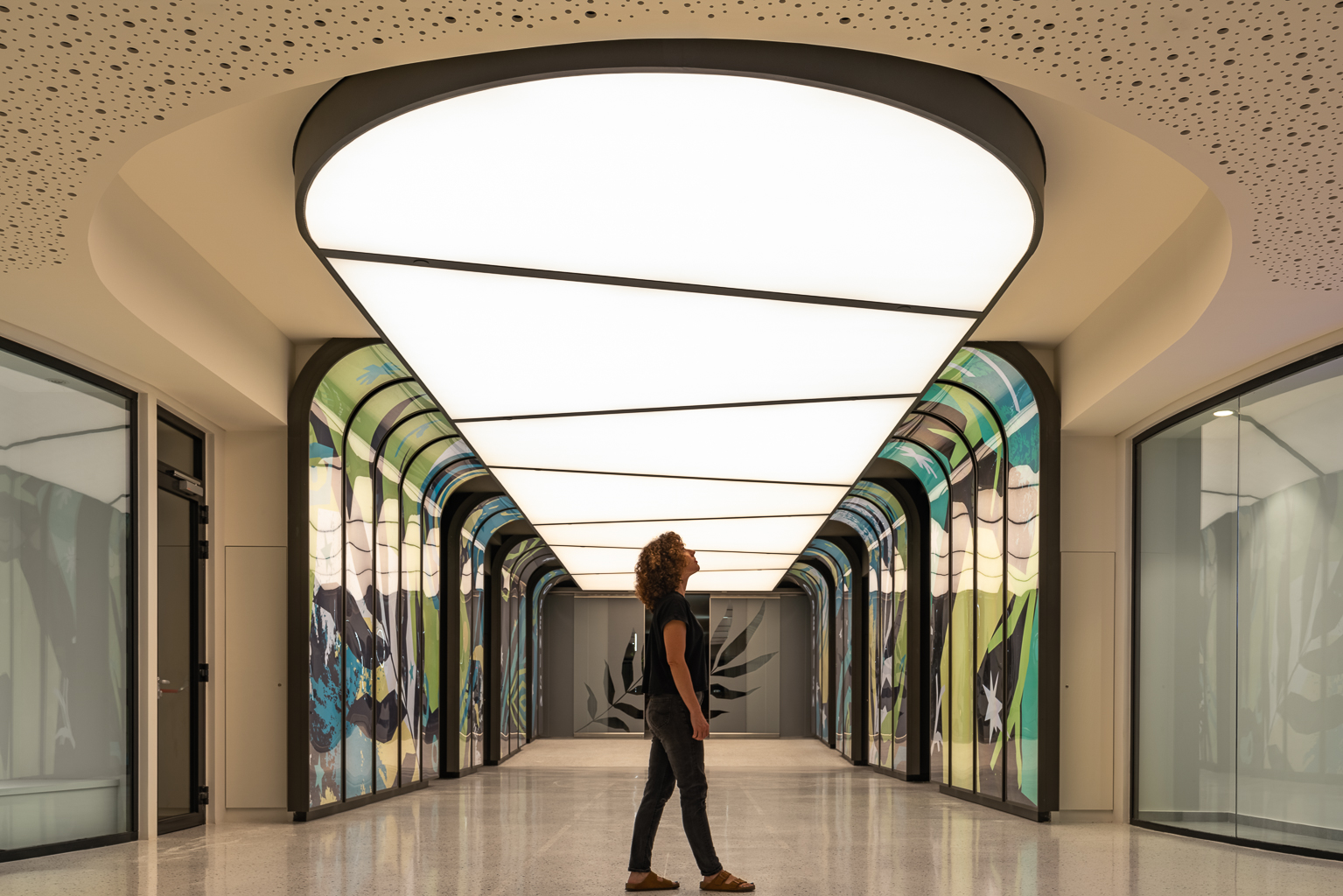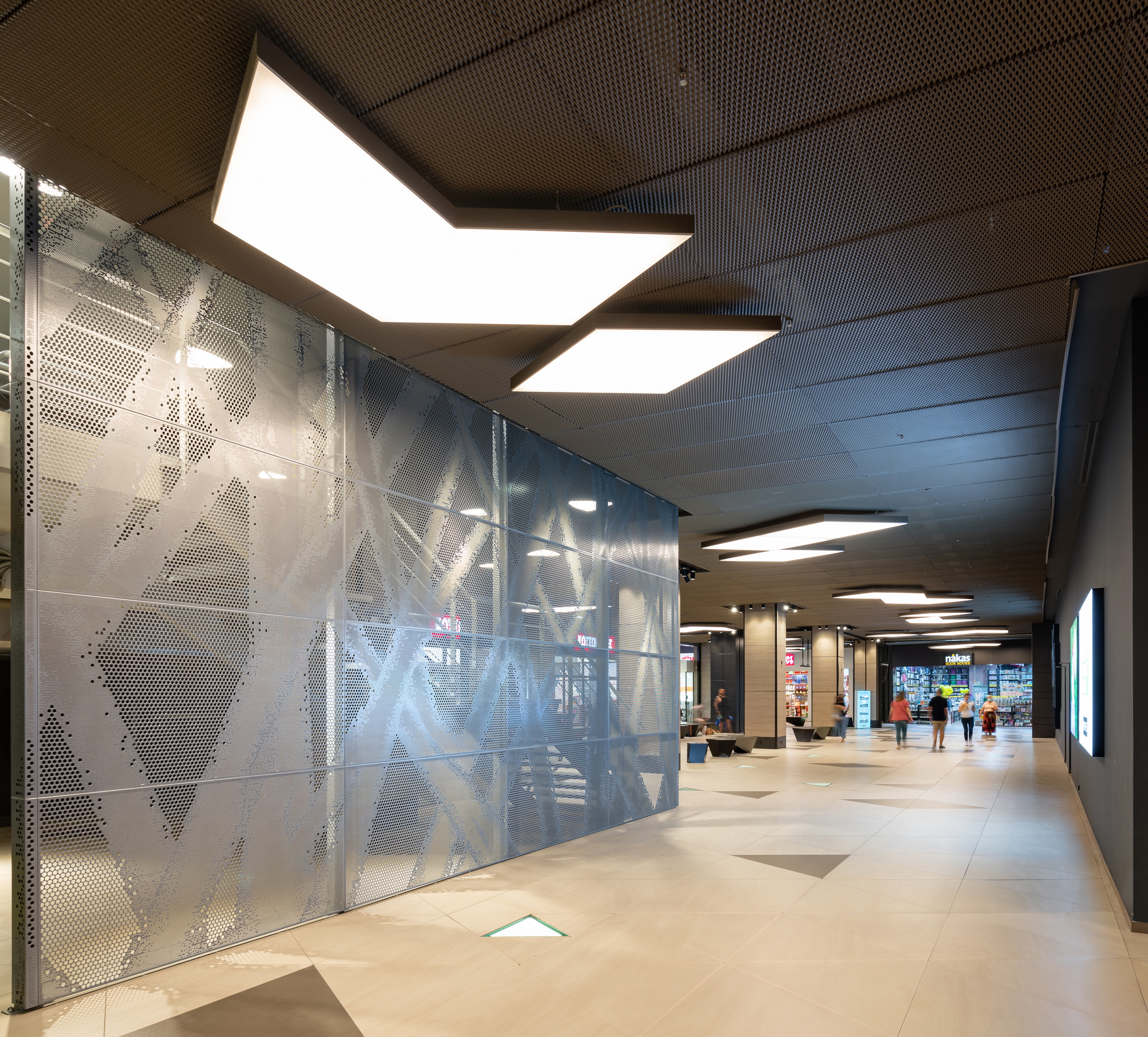 In an attempt to transfer the quality of the outdoor lighting to the interior of the mall, a light structure was built on the main axis of the transition zone and especially on the ceiling of the corridor, which occupied most of the elevation. It is punctuated by oblique black lines in correspondence with those of the floor.