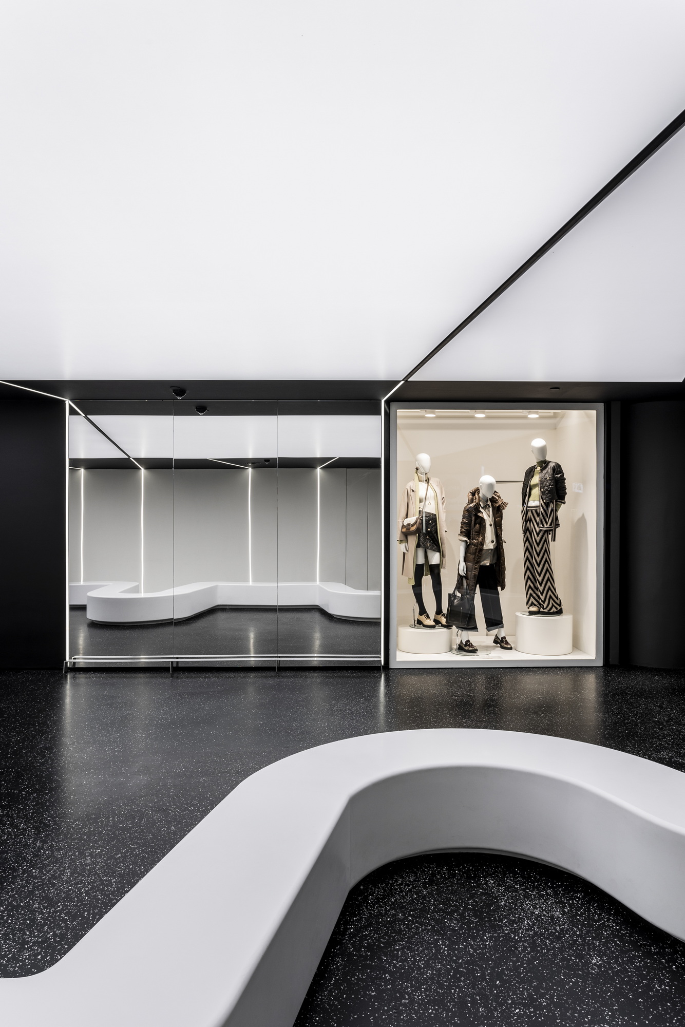The bright lines existing in the mall's cast floor were mentally extended to the new raised one. Then they climb up the vertical wall - the new boundary of the shop and from there to part of the roof. In this way, the existing logic of the kaleidoscope is preserved and redefined in the newly expanded study area.