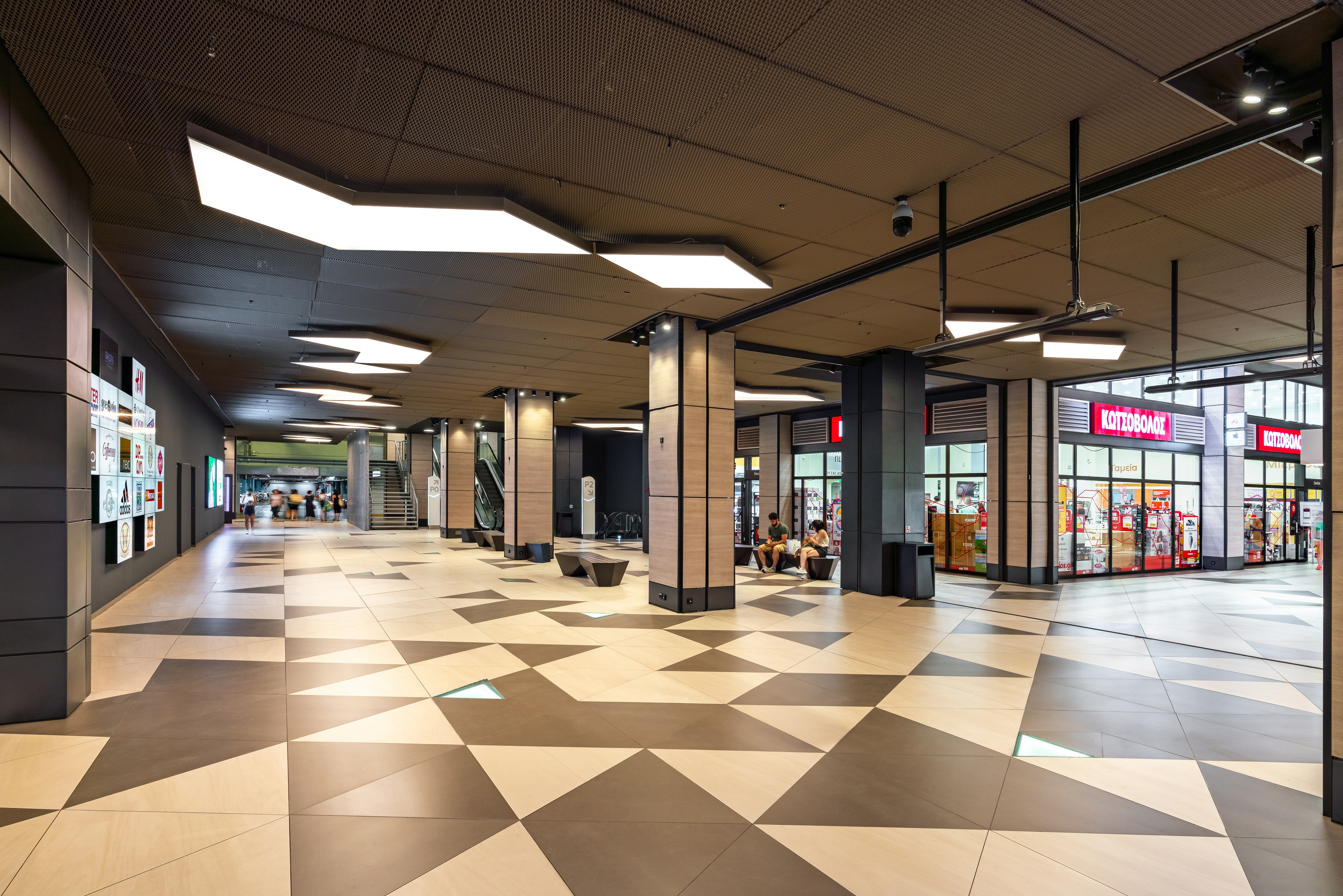 Even the garage with the new underground commercial area was differentiated. Special care was given to the new flooring to constitute a smooth transition from the architectural vocabulary that prevails in the floor of the existing commercial space, but also to refer to a different geometric design approach. Triangular tiles in two shades were located, while in some parts of them were placed inset triangular-shaped floor lamps with alternating lighting. The lighting in the basement area was strengthened to orient the visitor towards the new commercial spaces.