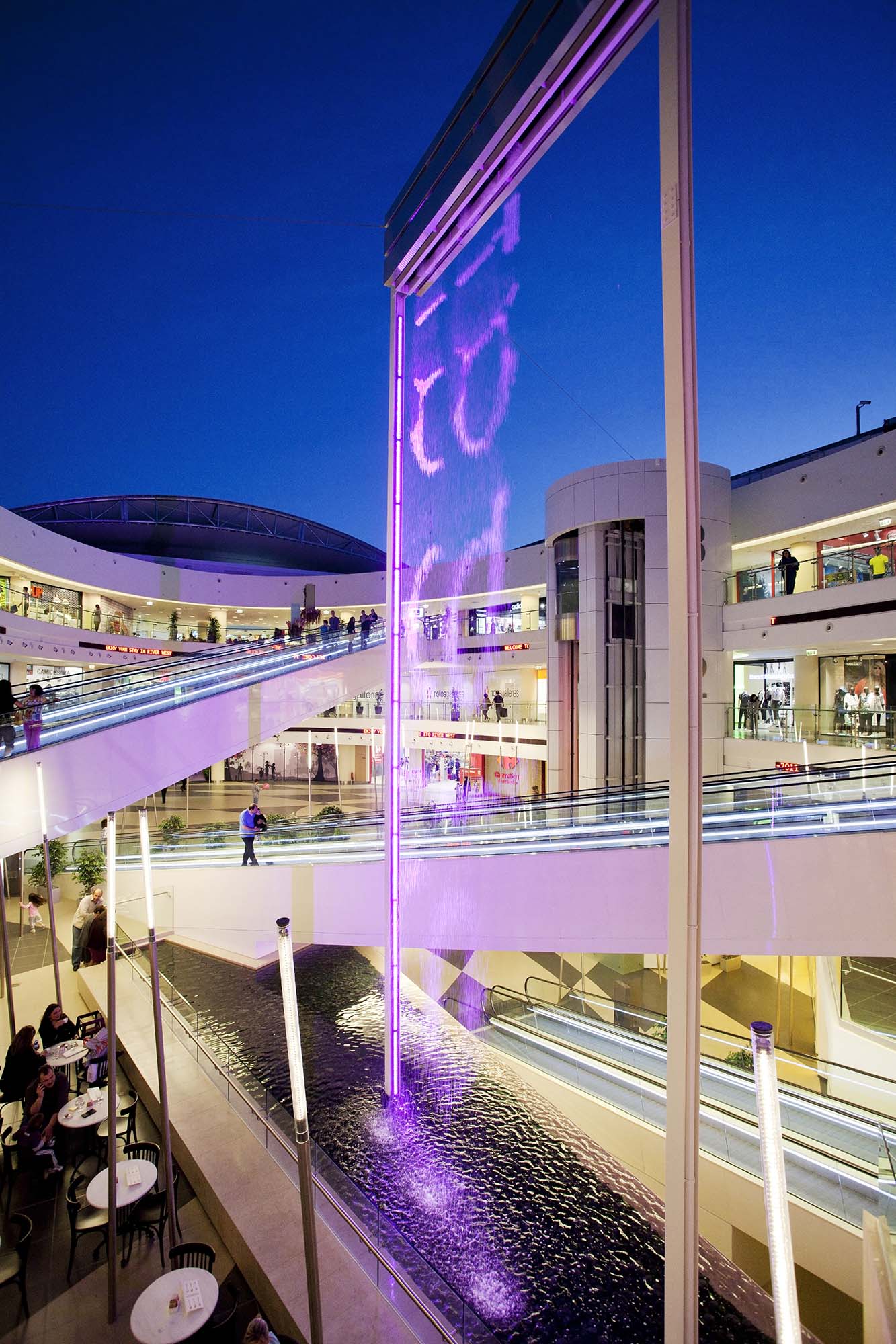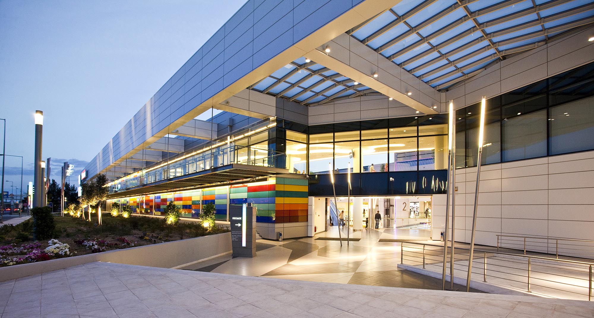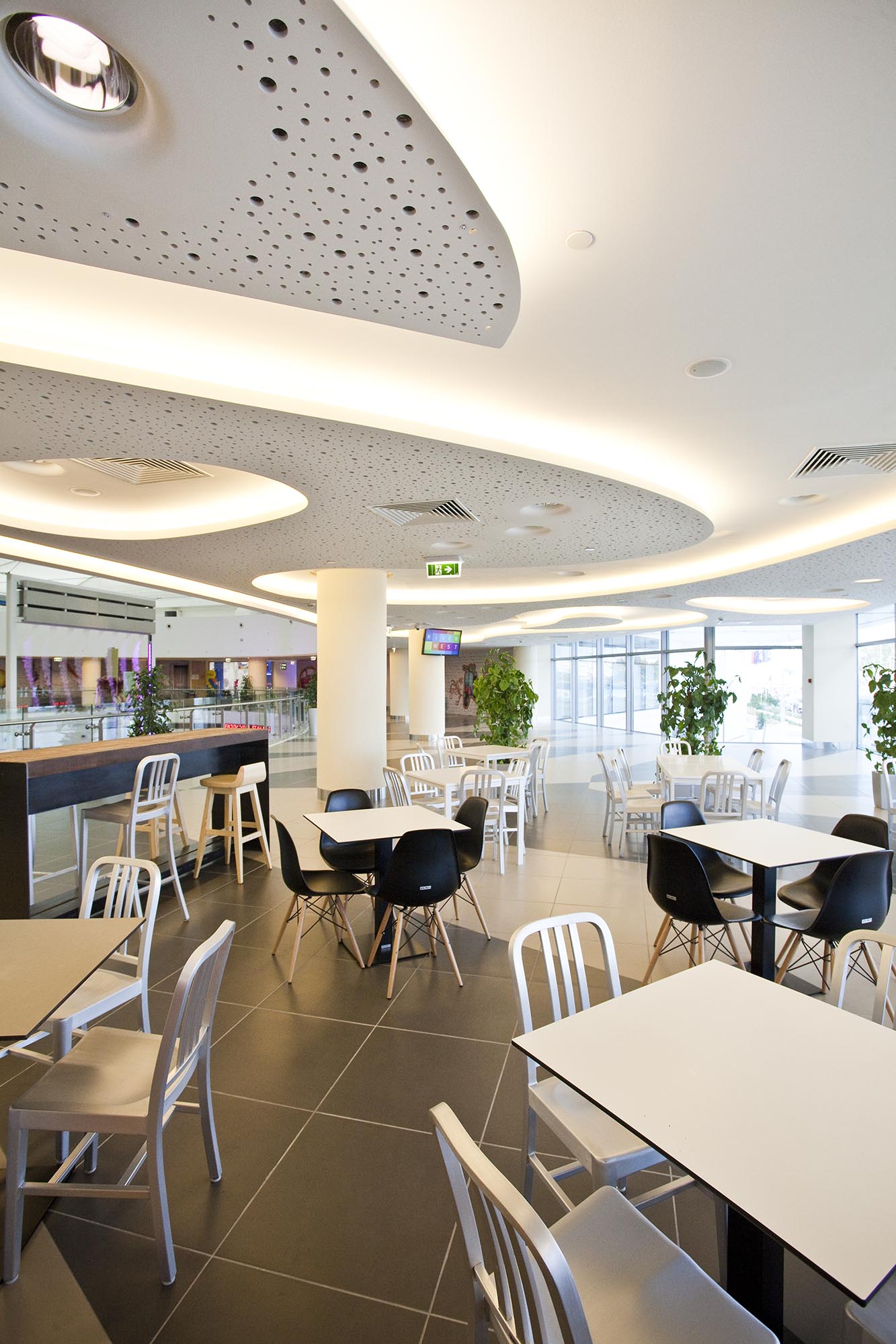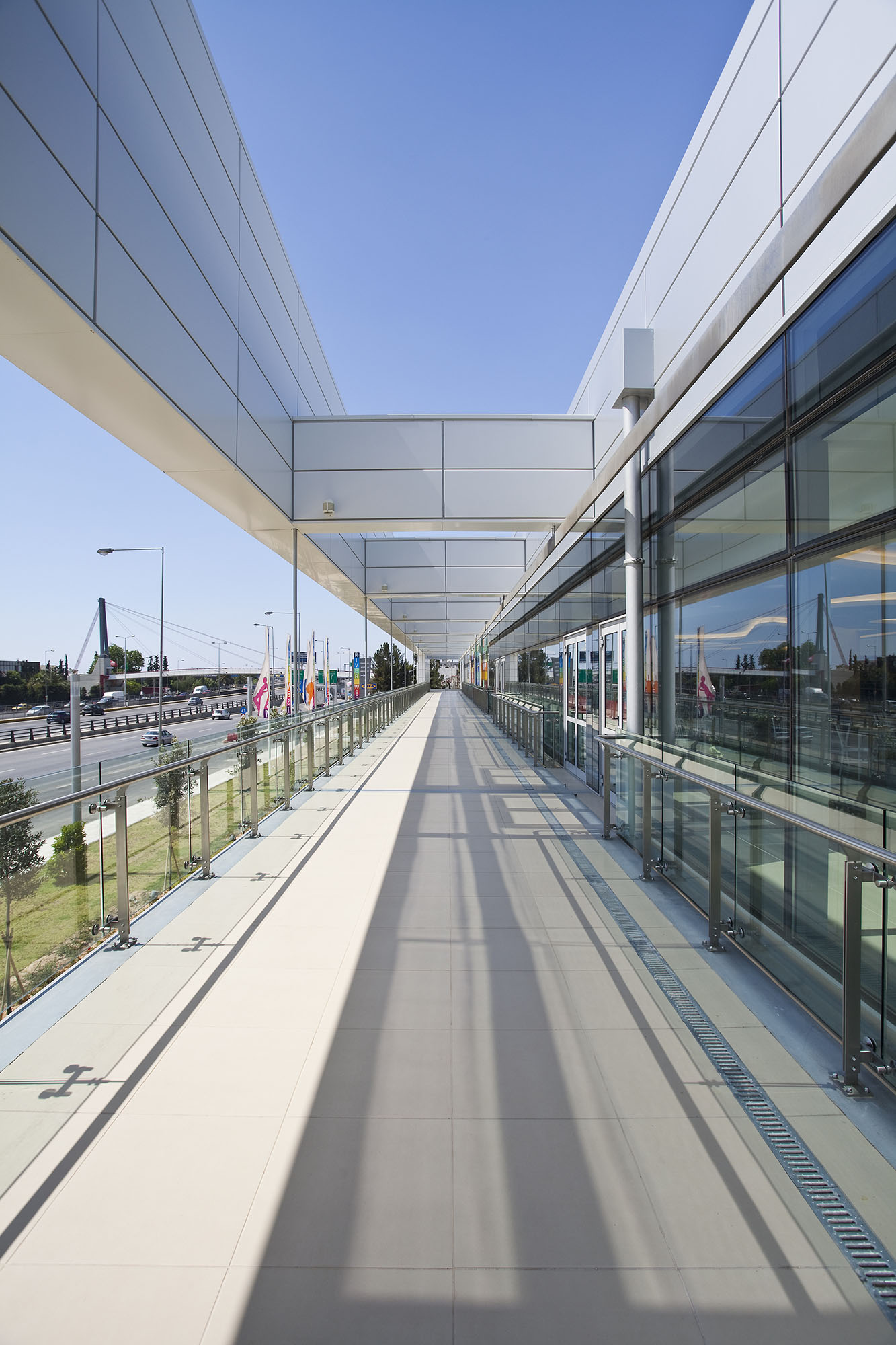 Two “hovering“ moving ramps connect the floors, running diagonally across the atrium’s void, lending a certain vigour to it. The ground floor pedestrian access corresponds to the intermediate level of the building’s second storey, while approach from the underground parking areas is through the atrium base – first level below ground. Restaurants and a café are located mainly on the upper level, arranged parallel to the front façade glass curtain walls, in order to provide view towards the atrium, the avenue and the Acropolis further back.