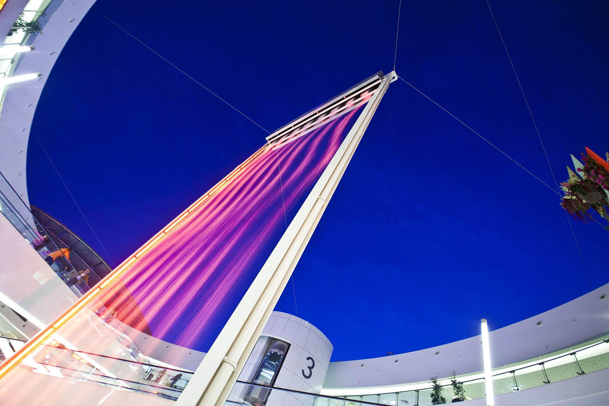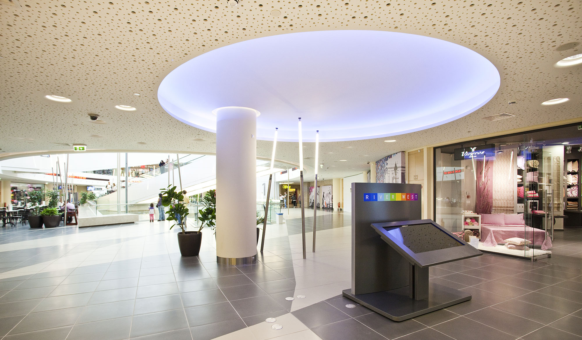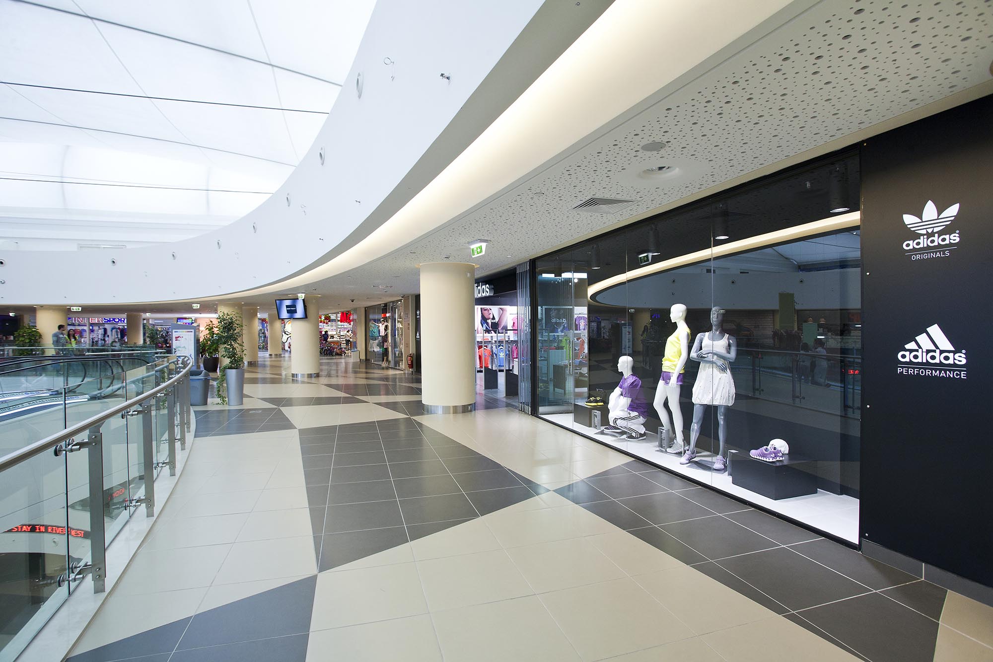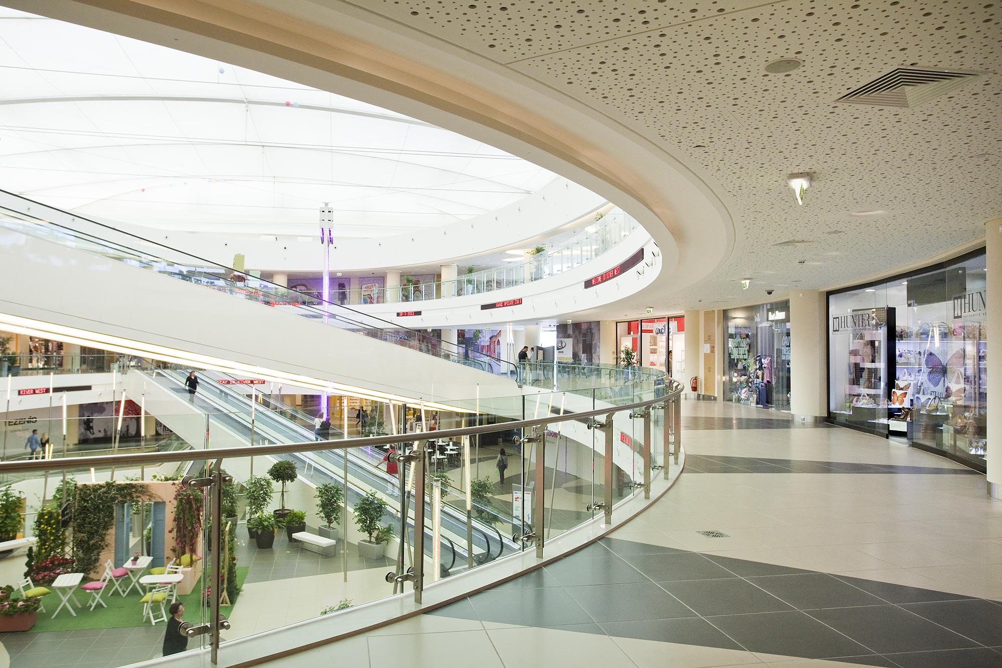 This building is part of a complex which also includes a department store and a common underground parking station. The main area of commercial stores has a rectangular plan and develops on three levels around an internal, depressed atrium of elliptical shape.