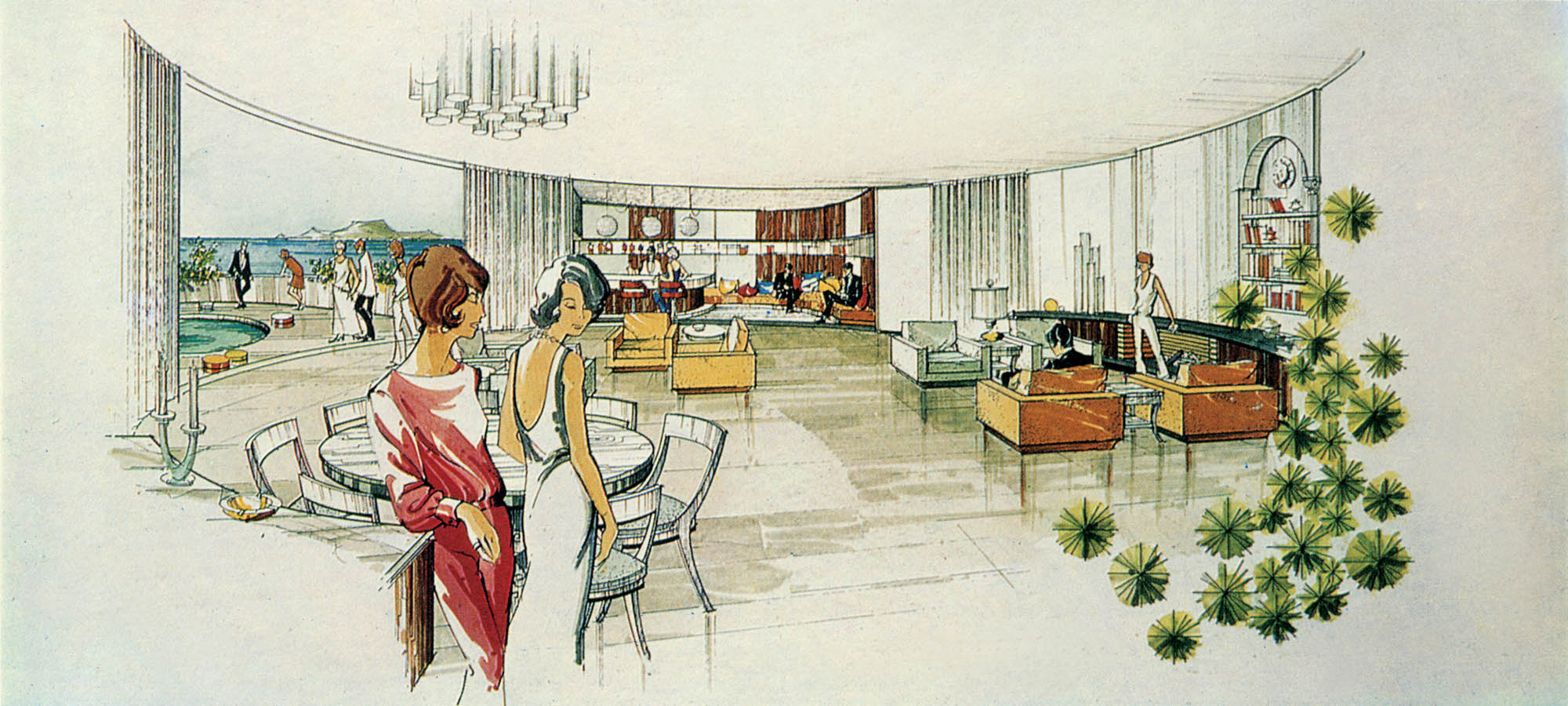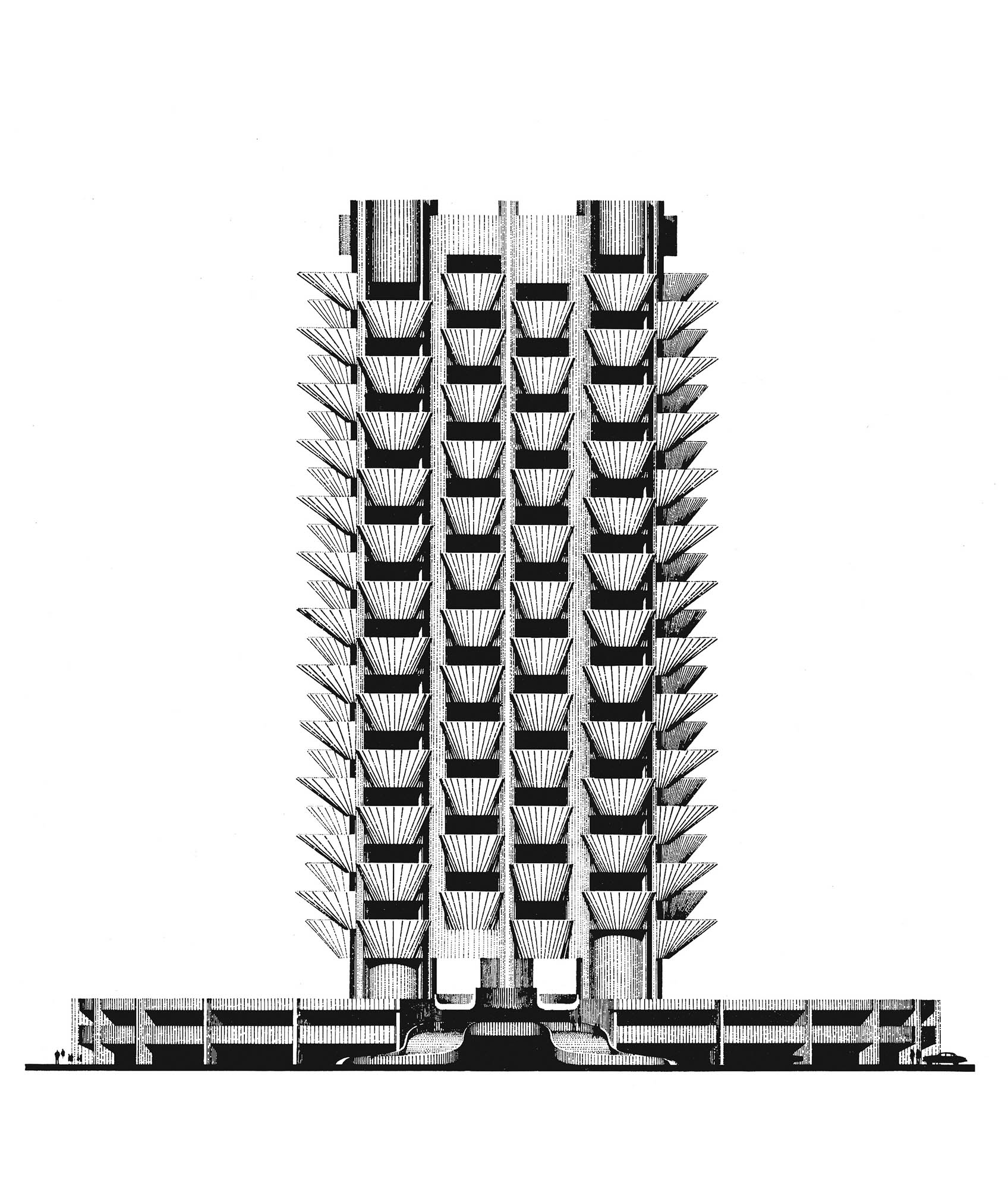 The main part of the building, in particular, conceived predominantly of white concrete, grew organically around a vertical quadruplex circulation core. The demand for large balconies with open-air swimming pools and semi-open-air spaces on the perimeter of the storeys set the structural parameters for the section of the building. Every apartment occupied a quarter of the round plan, taking advantage of the free view, while the private swimming pool of each apartment was supported on the rear side of the apartment below. This caused the alternate transposition, floor by floor, of the balcony-swimming pool, the whole and the void, on the cylindrical skin of the living rooms. The overall outcome led to a pulsating building envelope created by the open petals of the balconies.