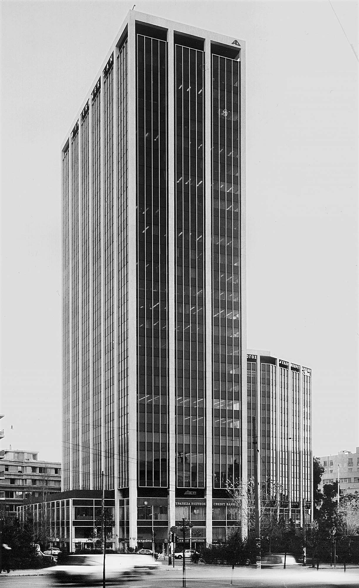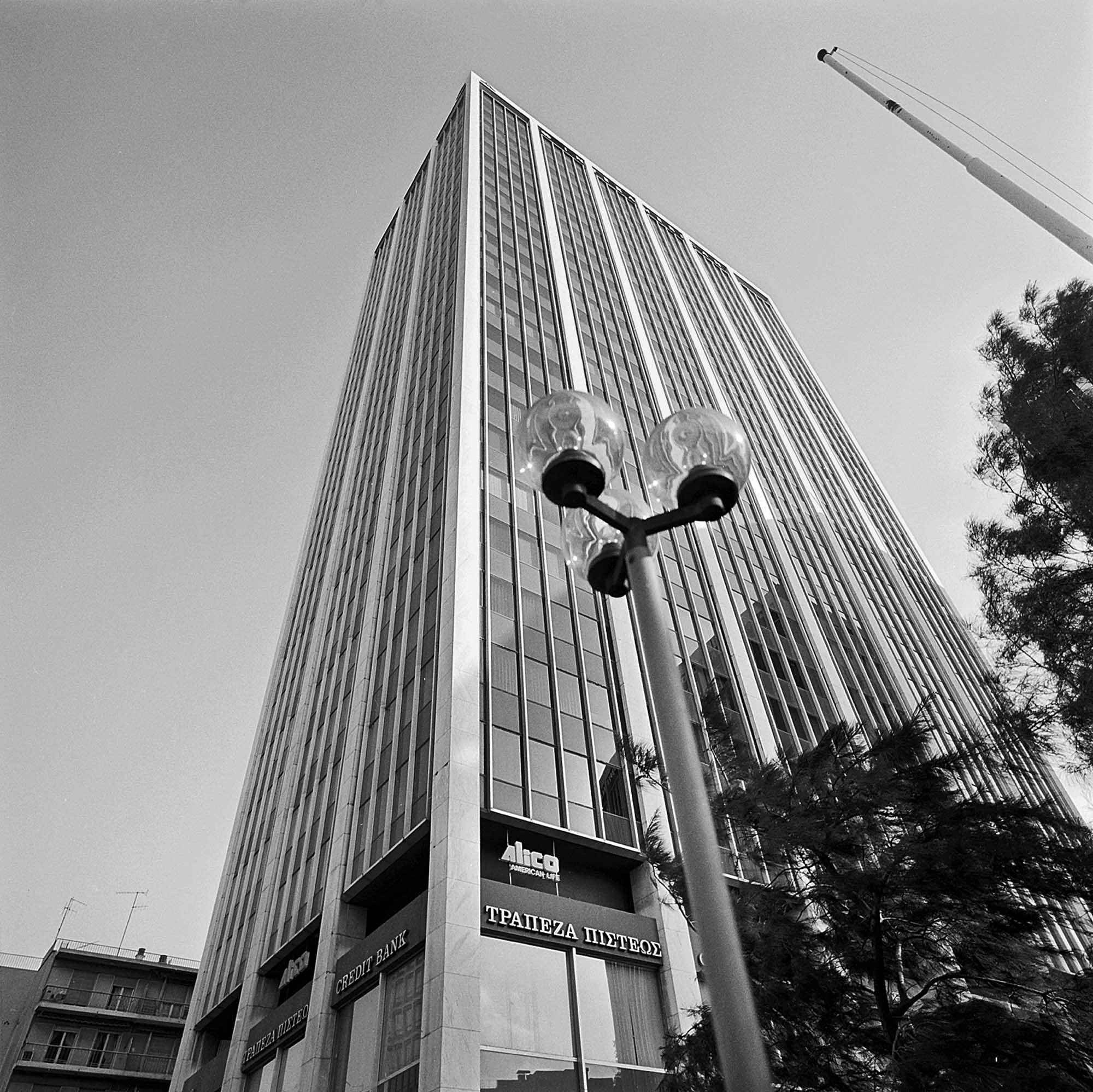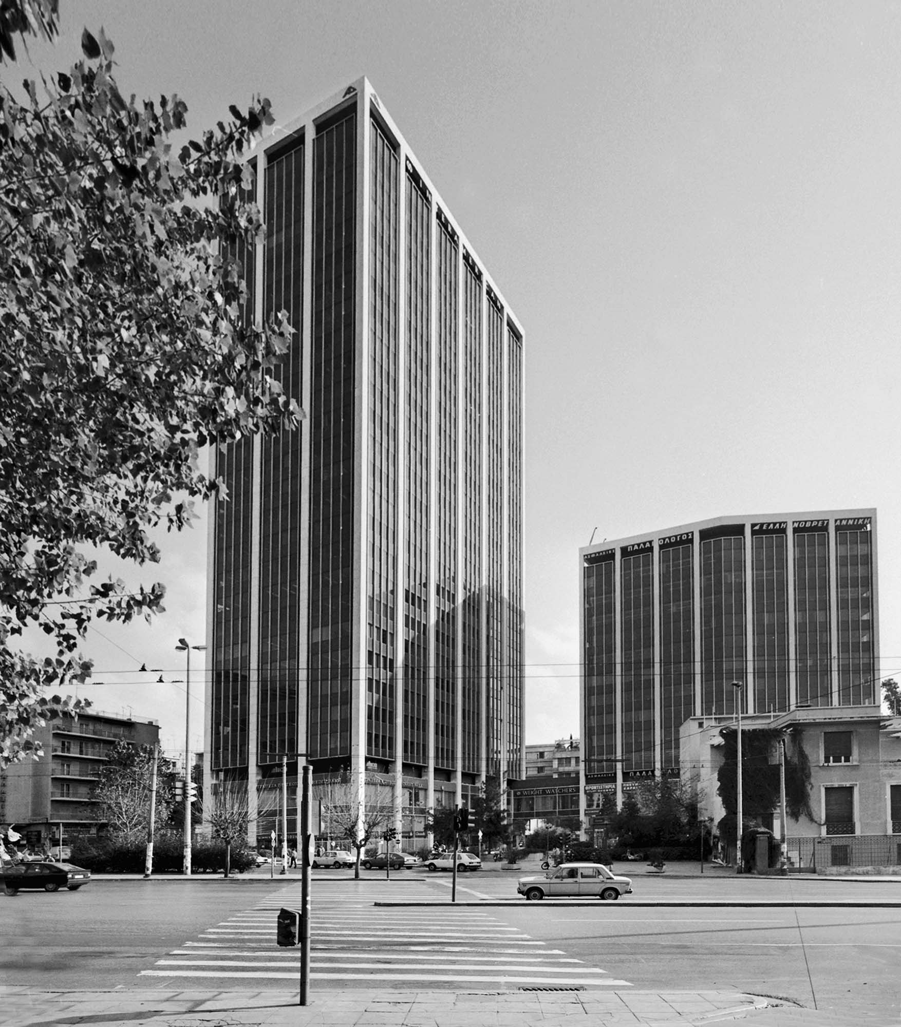 The Tower of Athens has the common typology of a skyscraper, with the central core of staircases and the surrounding office areas. What made it distinctive from the equivalent experience of an office tower abroad was the attempt to create a regionally justified form with base, body and crowning.